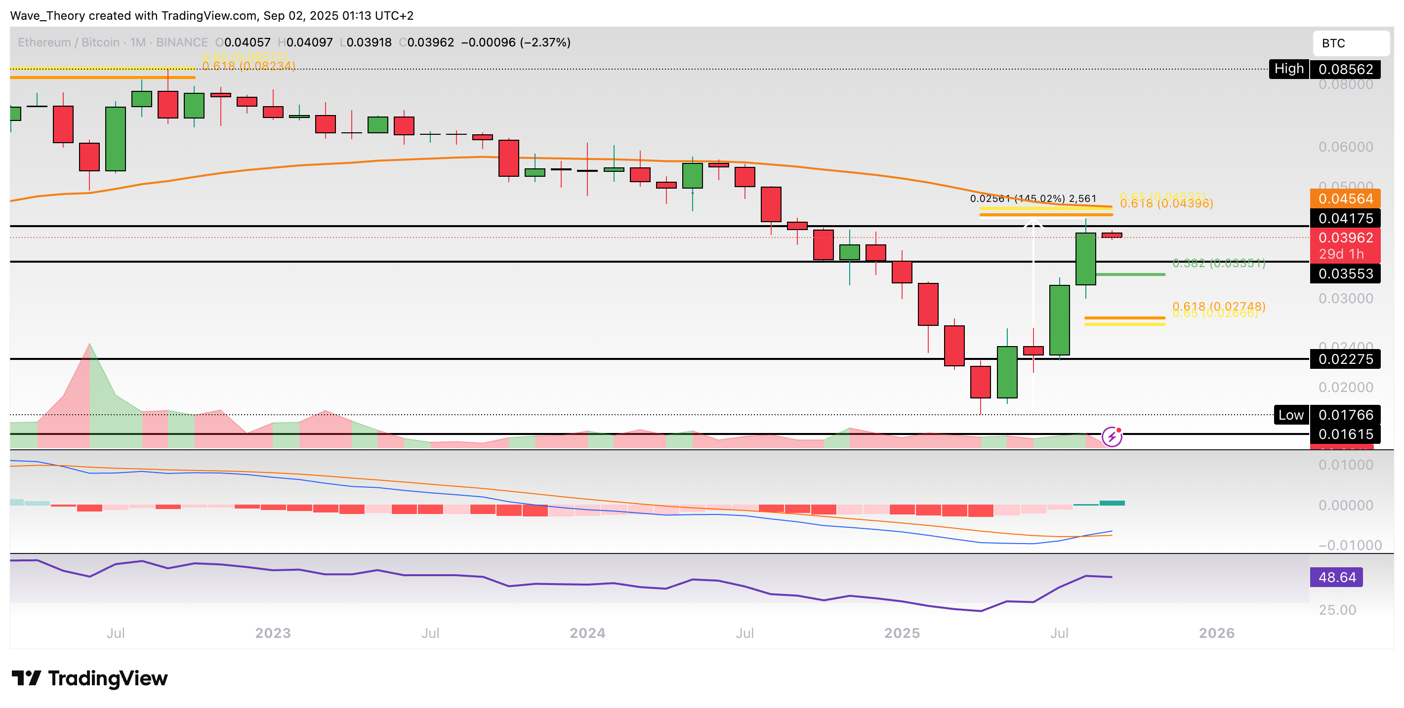 Korrigiert der Kurs jetzt, warten bei rund 0,033 BTC und 0,027 BTC die nächsten signifikanten Fibonacci Unterstützungen. Die Indikatoren zeigen sich dabei noch bullisch im Monatschart.