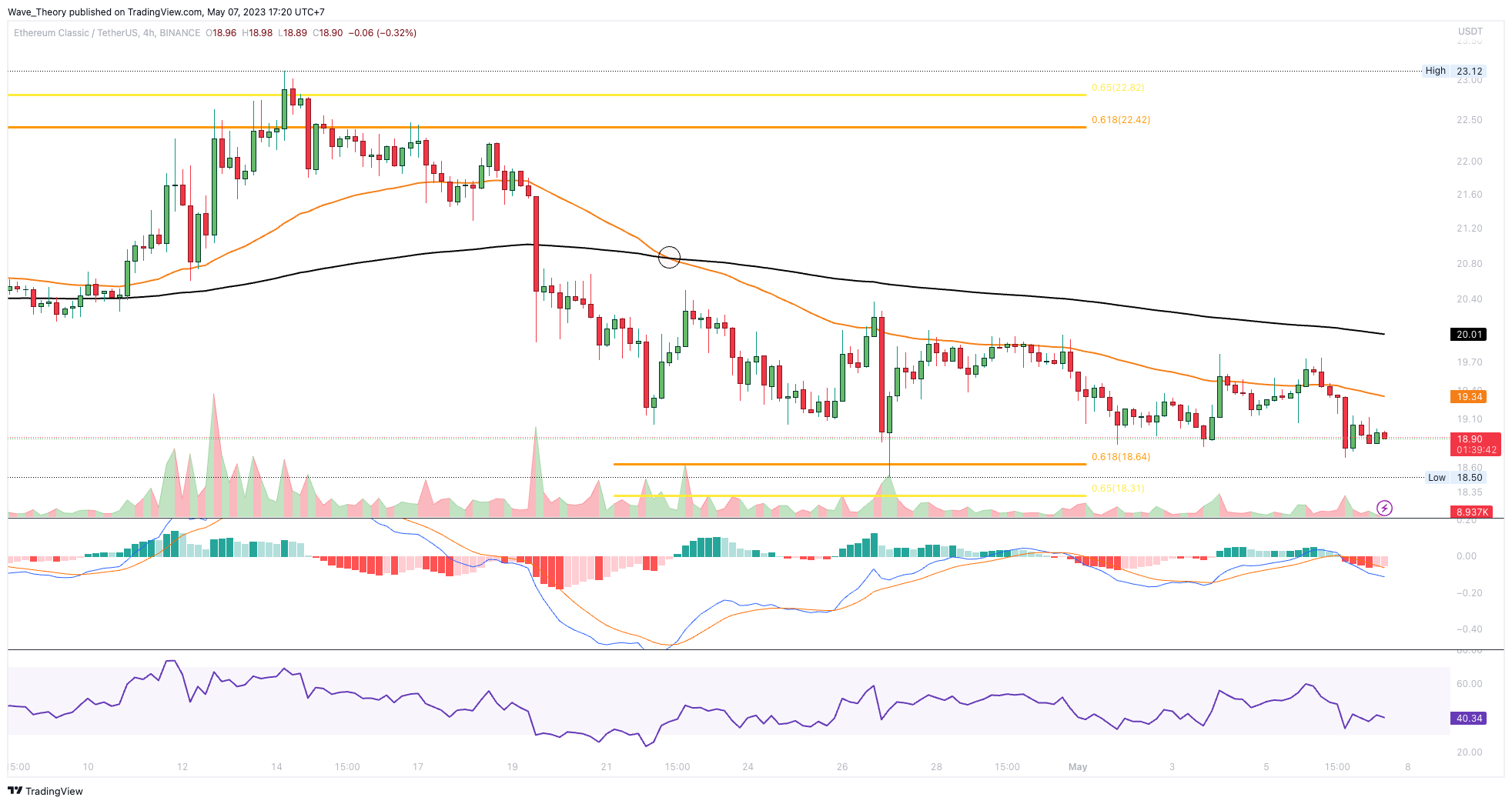 Damit überkreuzten sich auch die MACD Linien im Tageschart bärisch und das Histogramm des MACDs tickt seit gestern bärisch tiefer. Der RSI gibt dabei weder bullische noch bärische Signale. Jedoch liegt noch immer ein Death Cross der EMAs vor, womit der Trend kurz- bis mittelfristig bärisch bestätigt ist. Die Golden Ratio bei rund 18,5 USD bietet die letzte Chance, bullisch abzuprallen, bevor der Ethereum Classic Kurs eine Etage tiefer fällt.