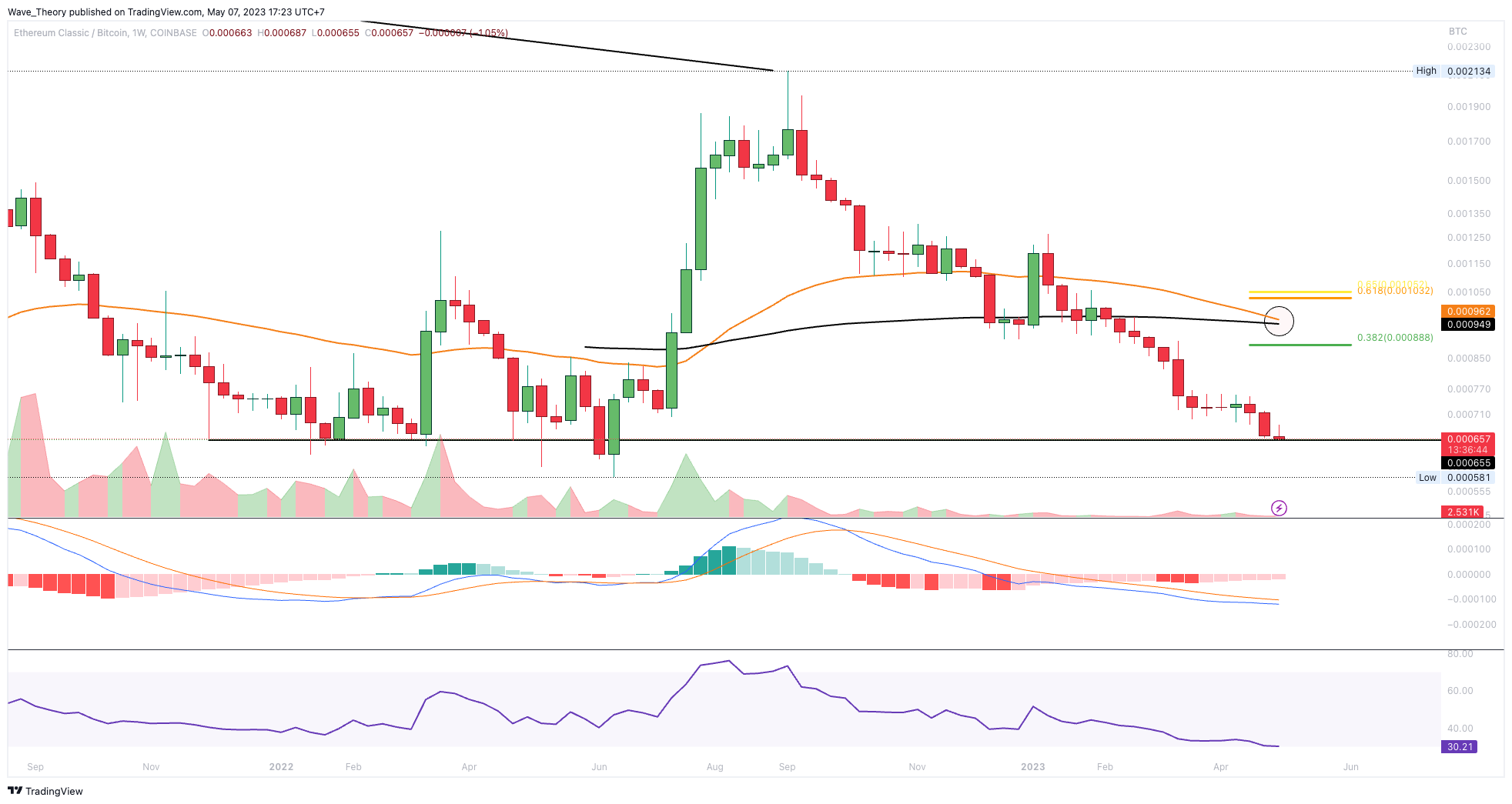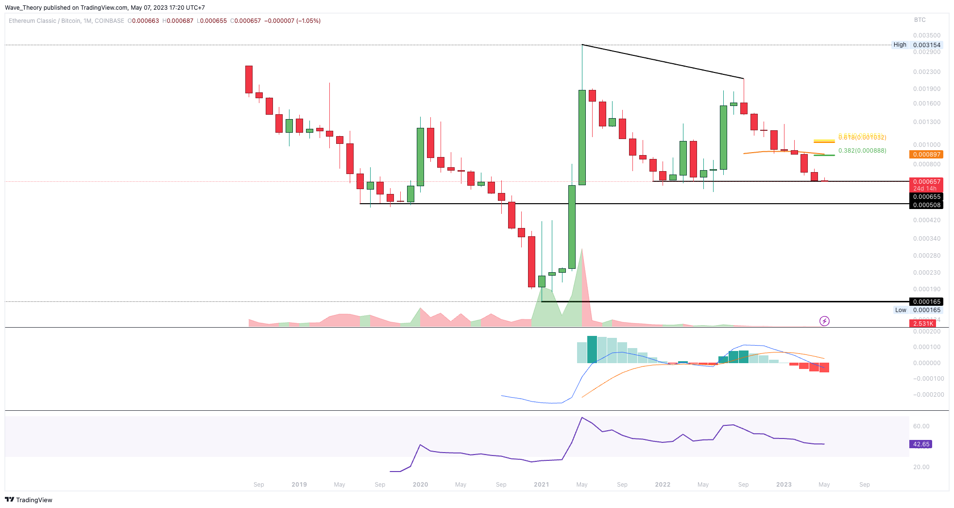 Auch gegen BTC bietet sich für Ethereum Classic jetzt die Gelegenheit, bullisch abzuprallen. Denn der ETC Kurs hat nun die signifikante Unterstützung zwischen rund 0,0005 BTC und 0,000655 BTC erreicht. Sollte ETC dort abprallen, warten bei rund 0,000888 BTC und bei rund 0,001 BTC die nächsten signifikanten Fib Widerstände. Bei rund 0,00089 BTC fungiert zudem der 50-Monate-EMA als zusätzlicher Widerstand.