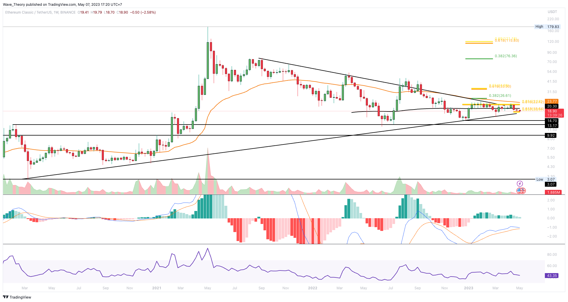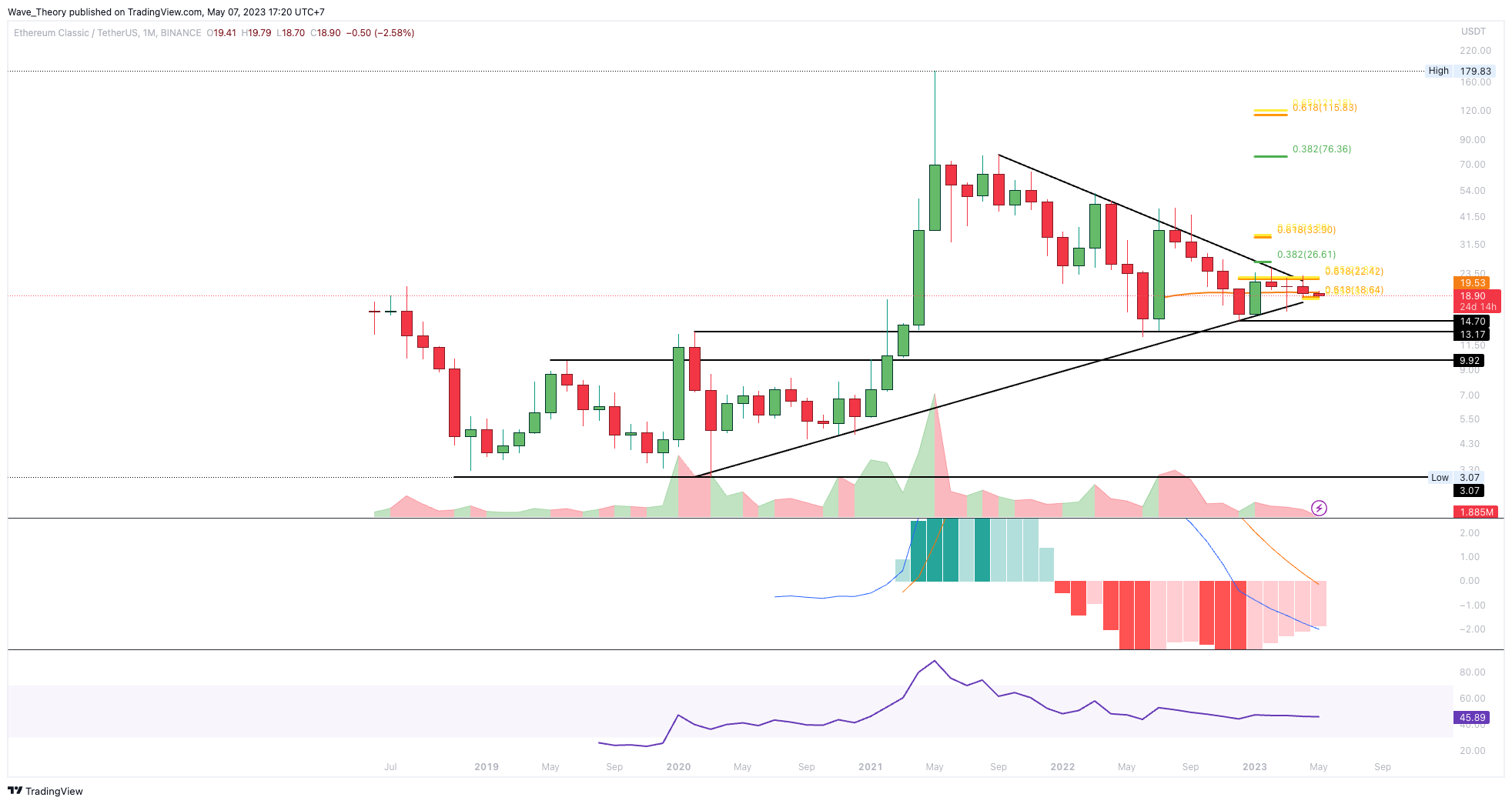 Der Ethereum Classic (ETC) Kurs hat nun die 50-Monate-EMA Unterstützung bei rund 19,5 USD bärisch gebrochen. Damit befindet sich der ETC Kurs an der letzten Fib Unterstützung, bevor ETC eine Etage tiefer fallen könnte. Denn wenn ETC die Unterstützung bricht und damit aus dem symmetrischen Dreieck bärisch ausbricht, könnte der Kurs eine Etage tiefer fallen.