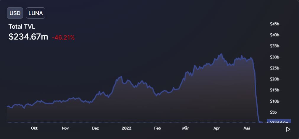 Besonders auffallend in Rodolphes Statement ist die Aussage “systemische Relevanz“. Vermutlich soll dies als eine Anspielung zum bitteren Ende der Terra-Blockchain samt Stablecoin UST gemeint sein. Bei einer Marktkapitalisierung USTs von knapp 19 Milliarden US-Dollar, waren nur noch die beiden Stablecoin-Giganten USDC und USDT vor UST gerankt. Ein Blick auf den Total Value Locked, lässt noch einprägsamere Schäden erkennen: Von den zuvor 29 Milliarden US-Dollar sind noch 250 Millionen übrig. Der Chart sieht eher aus wie ein Meme: