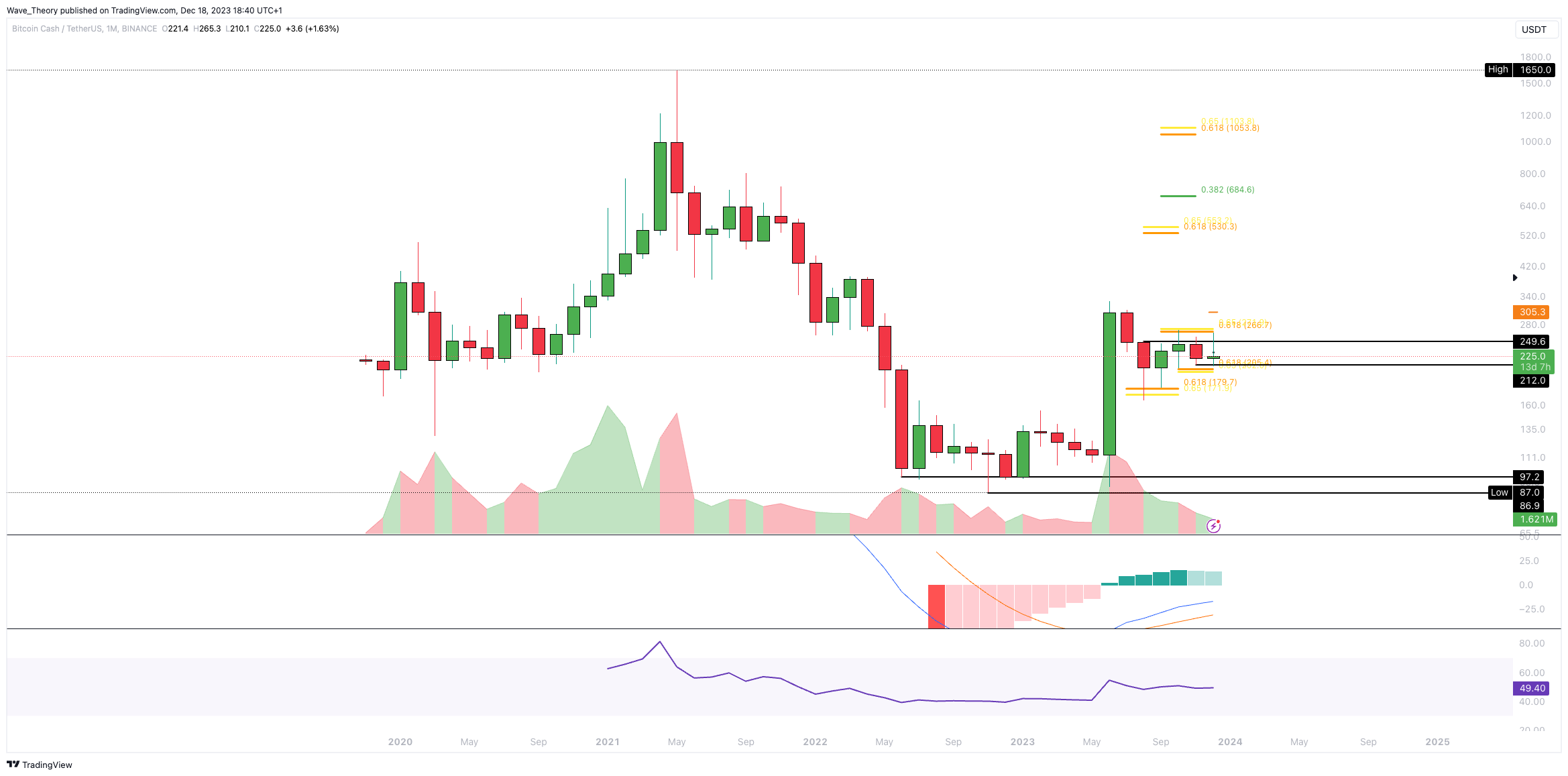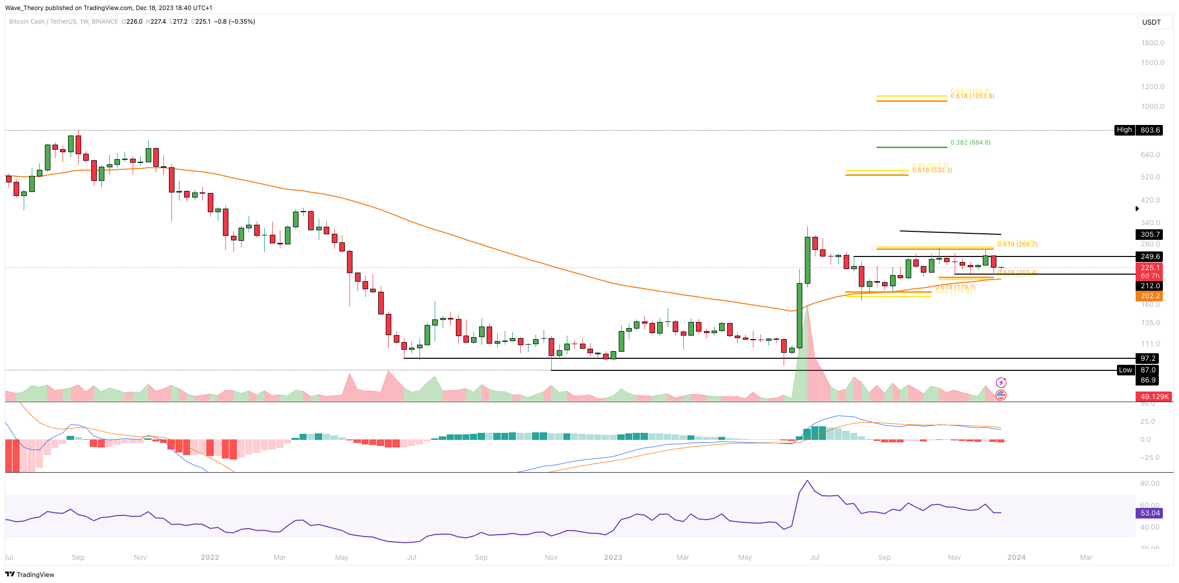 Knapp darunter, bei rund 202 USD, fungiert der 50-Wochen-EMA als zusätzliche Unterstützung. Ansonsten wartet spätestens bei rund 180 USD signifikante Fib Unterstützung auf den BCH Kurs.
