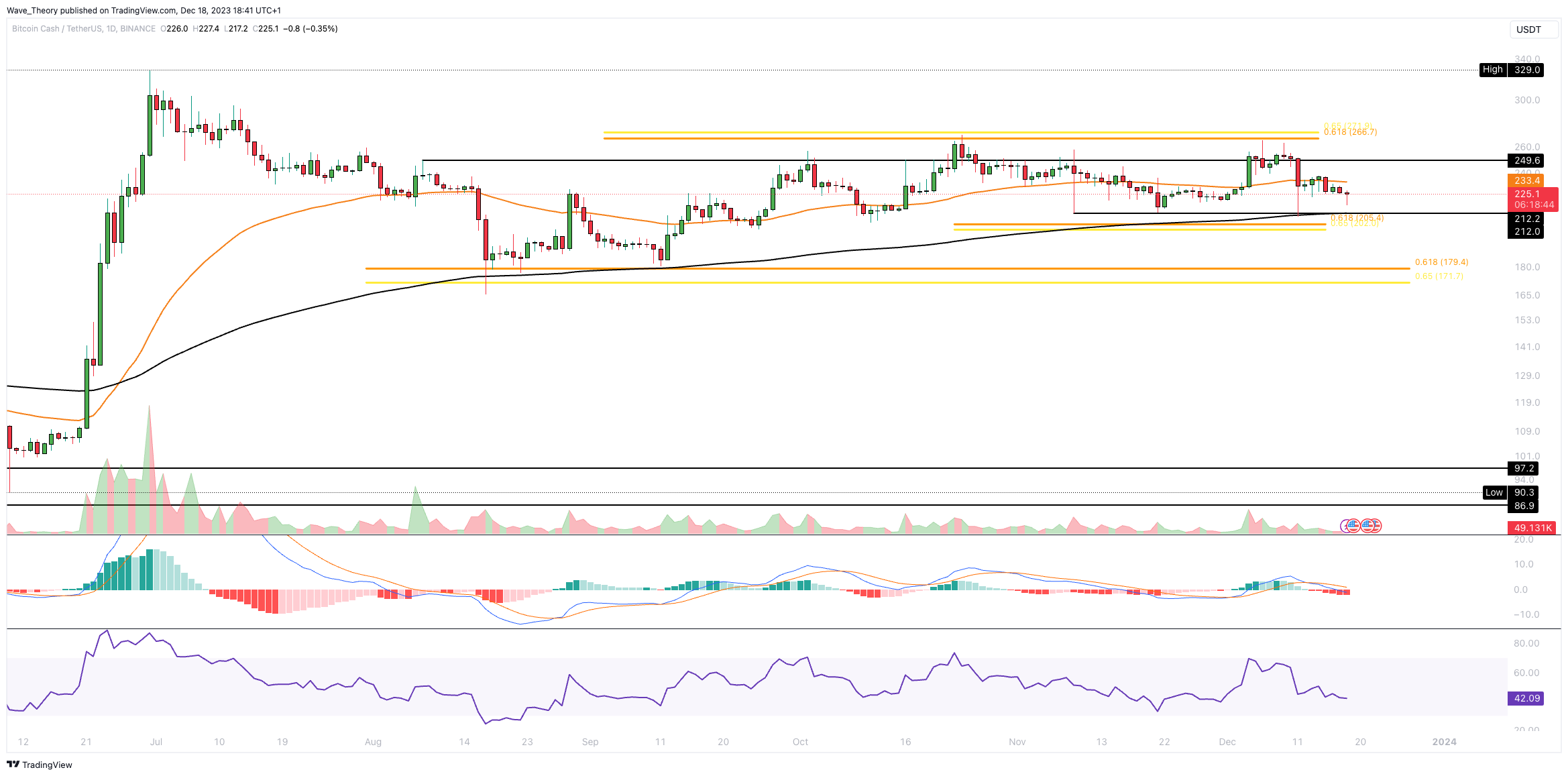 Der Bitcoin Cash Kurs wurde erneut am Golden Ratio Widerstand bei rund 270 USD bärisch abgewiesen