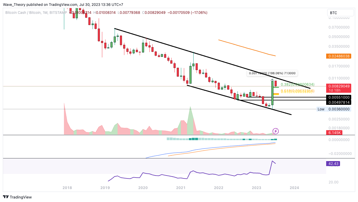 SponsoredAuch gegen BTC stößt der Bitcoin Cash Kurs jetzt auf die 0,382 Fib Unterstützung