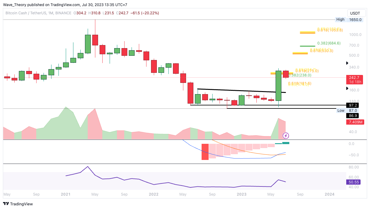 Der Bitcoin Cash Kurs stieg vor wenigen Wochen auf rund 329 USD und befindet sich seither in einer Korrekturbewegung. Damit erreichte der Kurs jetzt die 0,382 Fib Unterstützung bei rund 238 USD, woran der Kurs bullisch abprallen könnte. Ansonsten wartet bei rund 181 USD die nächste signifikante Fib Unterstützung. Dort eilt zudem der 50-Wochen-EMA zu Hilfe, welcher als zusätzliche Unterstützung dient.