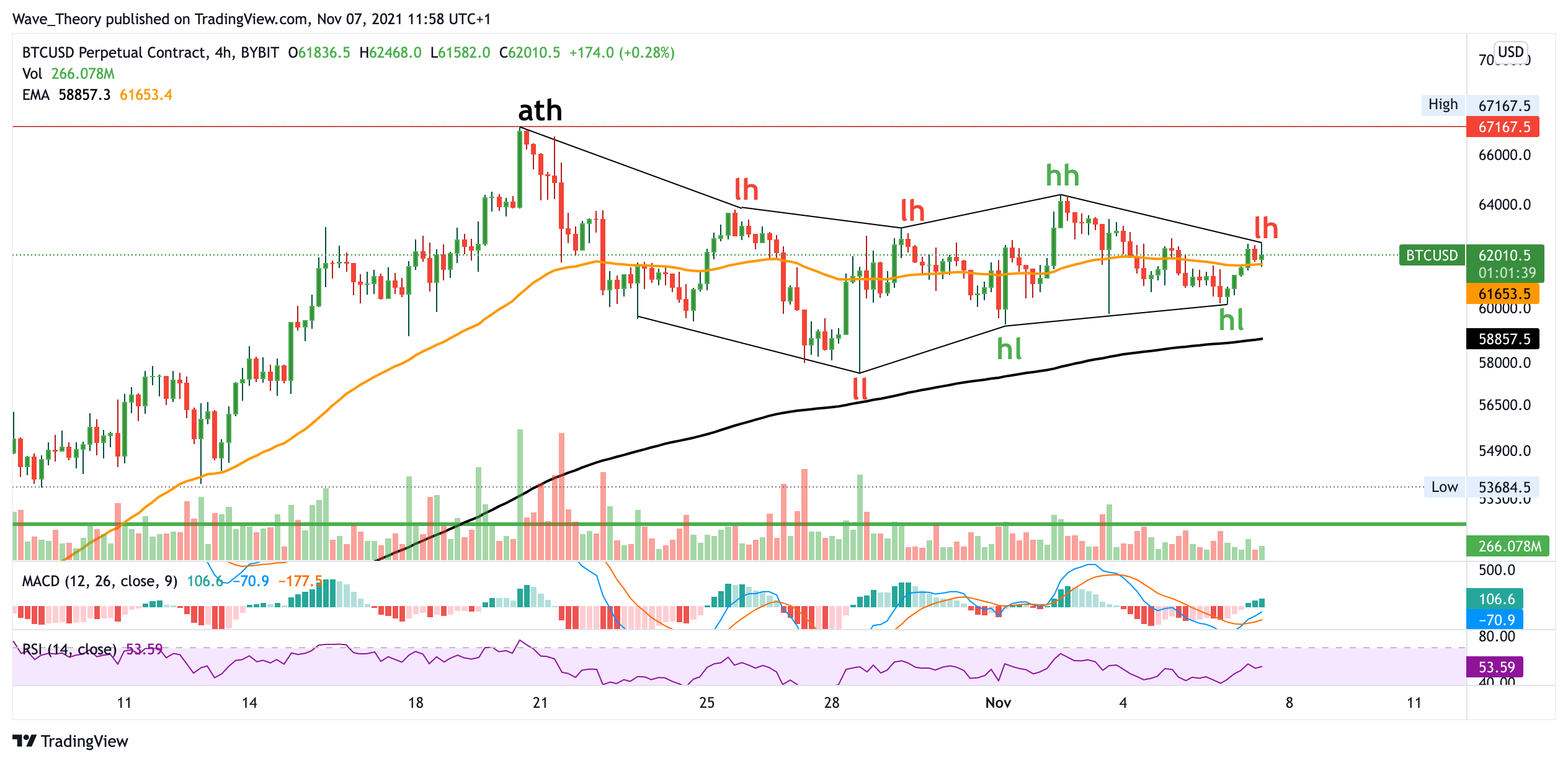 Im 4H-Chart formte der BTC Kurs insgesamt drei “lower highs” und ein “higher high”, seit er das Allzeithoch bei rund 67.000 USD etablierte. Jedoch formte er in Zuge dessen nur ein “lower high” und zwei “higher lows”. Sollte ein drittes “higher low” folgen, wäre es ausgeglichen, womit der kurzfristige Trend in dieser Hinsicht neutral wäre. Da die EMAs aber immer noch bullisch überkreuzt sind und sich der MACD sehr bullisch entwickelt, ist der 4H-Chart insgesamt bullisch zu betrachten.