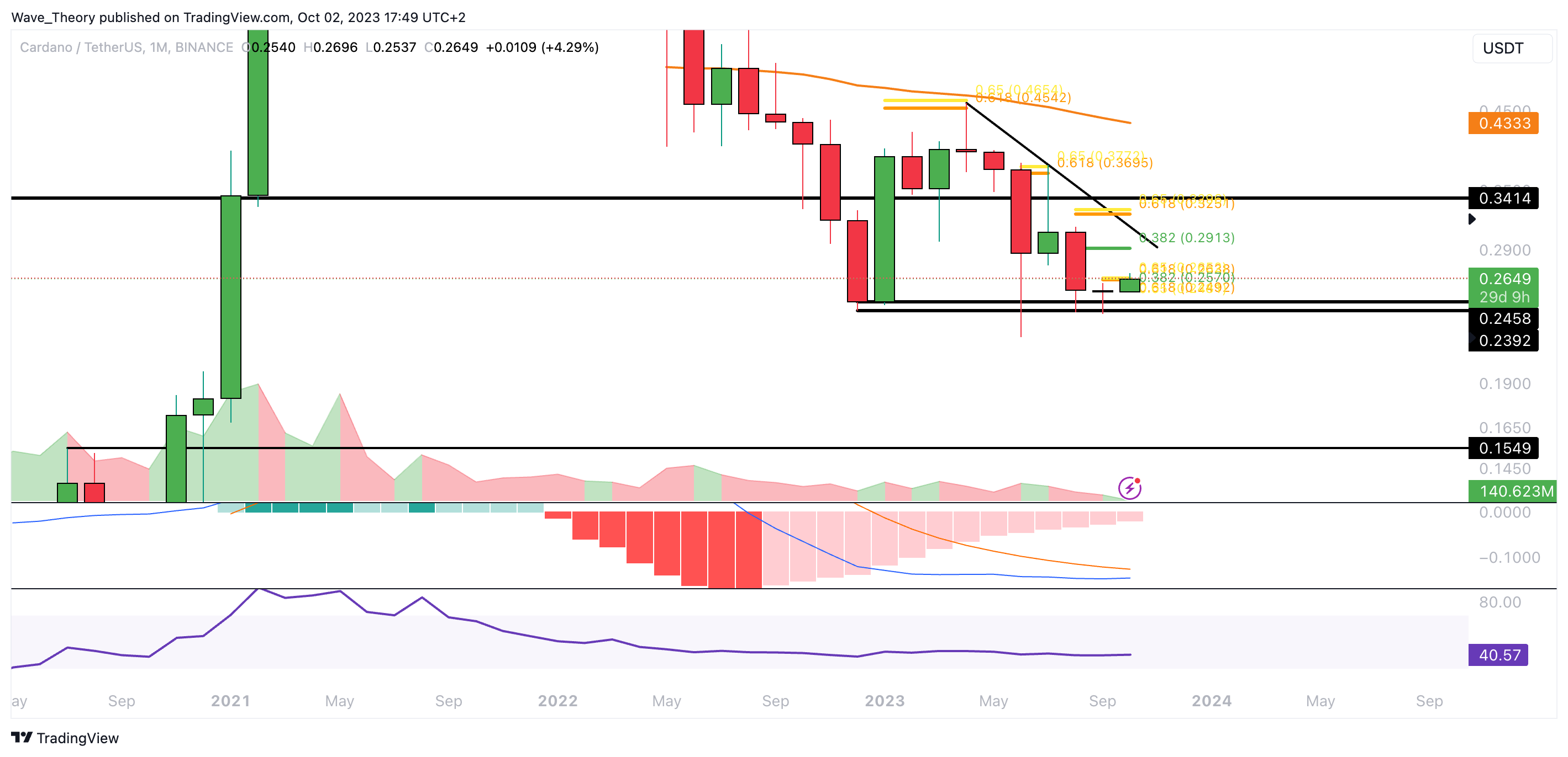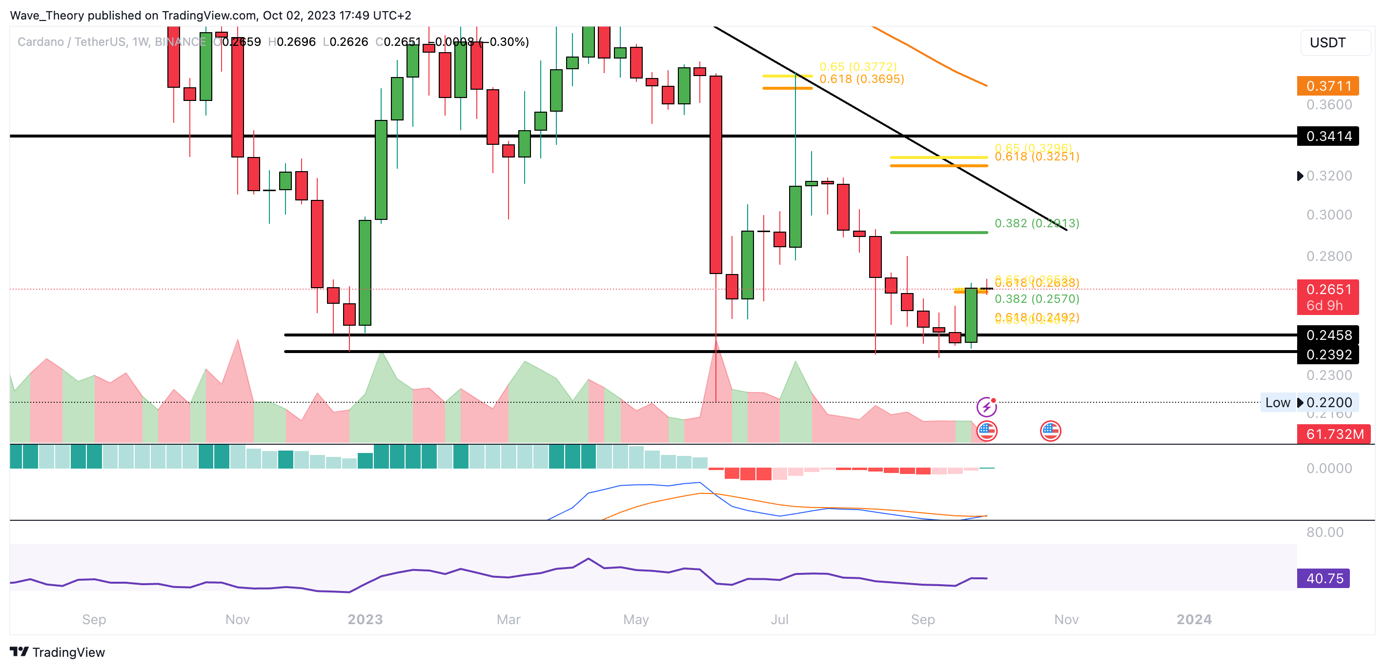 Wenn der ADA Kurs den Golden Ratio Widerstand bullisch bricht, könnte er das 0,382 Fib Niveau bei rund 0,2913 USD anvisieren. Bricht Cardano hingegen die nächsten Fib Unterstützungen, wartet spätestens zwischen rund 0,24 USD und 0,245 USD signifikante Fib Unterstützung auf den ADA Kurs.