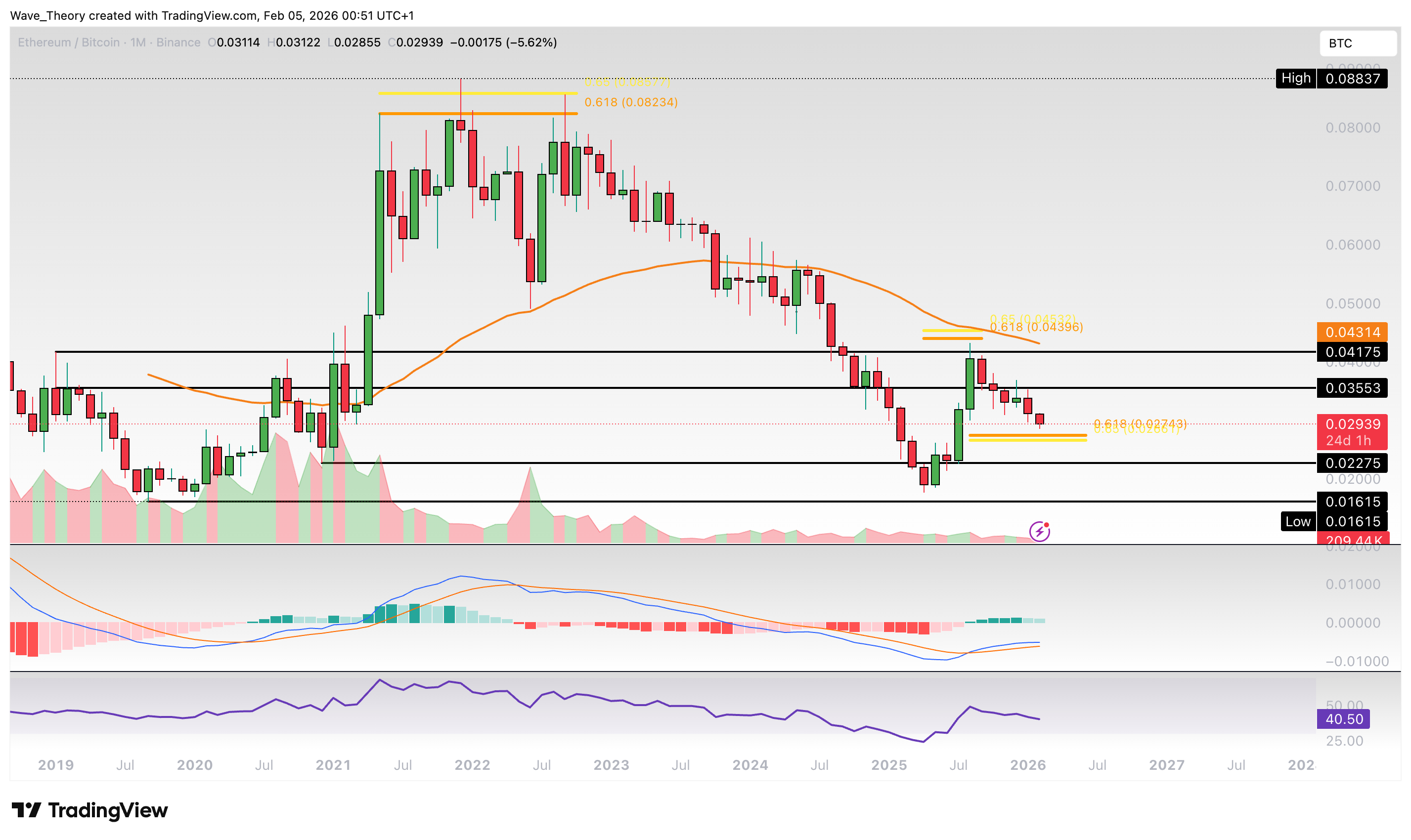 Mit einem bullischen Abpraller rücken die nächsten relevanten Widerstandsbereiche zwischen etwa 0,0355 BTC und 0,04175 BTC in den Vordergrund. Darüber hinaus befindet sich am Golden Ratio Niveau bei ungefähr 0,044 BTC ein entscheidender Widerstand, der durch den dort verlaufenden 50-Monate-EMA zusätzlich verstärkt wird.