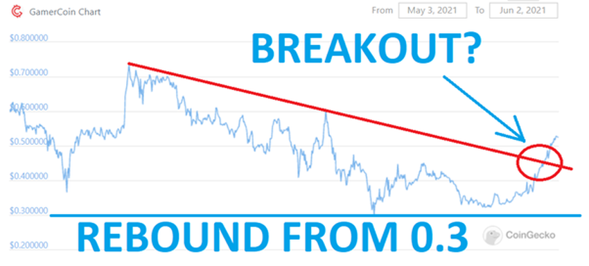 Obwohl das Interesse an dem Token aktuell nicht mehr so hoch ist wie noch vor ein paar Monaten, konnten wir einen möglichen Ausbruch auf dem Chart erkennen. Der GMR Preis befand sich zum Zeitpunkt der Charterstellung bei ca 0,55 USD-Dollar. Der Kurs könnte möglicherweise weiter steigen.