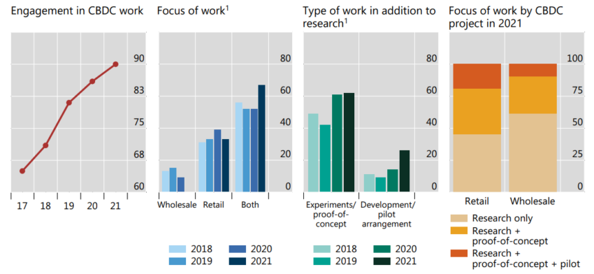 Die Bank für internationalen Zahlungsausgleich (BIZ) befragte 81 Zentralbanken über die Einführung von CBDS. Wie das Ergebnis zeigte, befinden sich 60 % der Zentralbanken in einer Testphase, während 26 % Pilotprojekte durchführen. Die Zahl der Banken, die eine Prüfung des digitalen Zentralbankgeldes ankündigten, hat sich allein im Jahr 2022 fast verdoppelt.