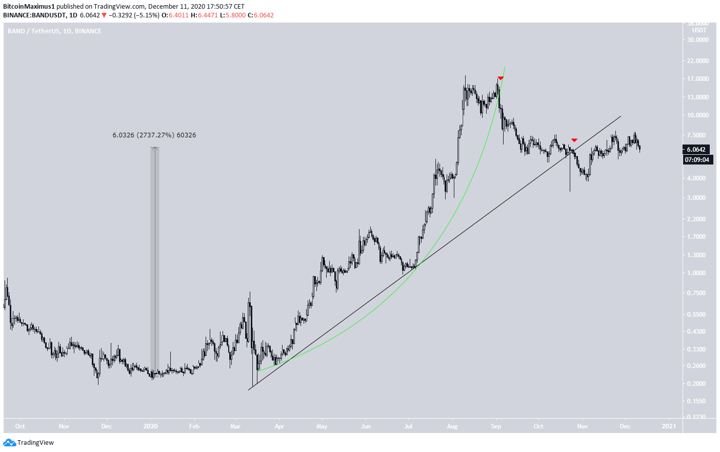 Von den Coins, die wir skizziert haben, ist BAND die Erste, die sich von ihrer Struktur gelöst hat. Dies gilt unabhängig davon, ob man eine Parabel (grün) oder eine aufsteigende Stützlinie (schwarz) verwendet. Dies ist ein bärisches Zeichen und wenn BAND weiter abnimmt, könnte es als Benchmark für die anderen Coins mit ähnlichen abgeschlossenen Aufwärtsbewegungen dienen.