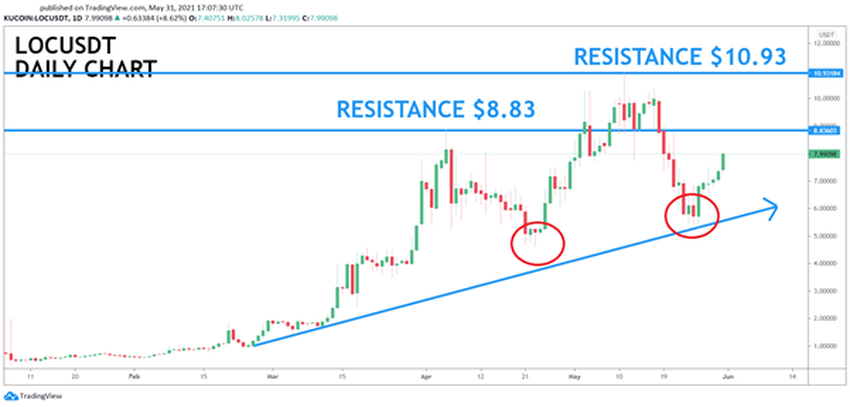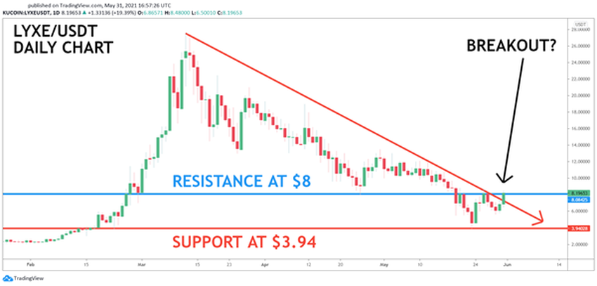 In der letzten Woche stieg der LUKSO um 30 Prozent! Es könnte also jeden Augenblick zum Durchbruch kommen! Wenn es gelingt, die Abwärtsspirale zu durchbrechen (siehe roter Pfeil), dann kann es mit diesem Low-Cap-Kandidat im Juni wieder rasant bergauf gehen!