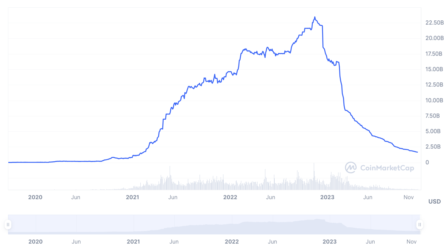 Noch bis August galt BUSD als einer der größten Stablecoins, nachdem die Marktkapitalisierung im November 2022 ein Allzeithoch von über 23,3 Milliarden USD erreicht hatte. Allerdings ist sie seitdem um mehr als 92 % auf etwa 1,7 Milliarden USD gesunken.
