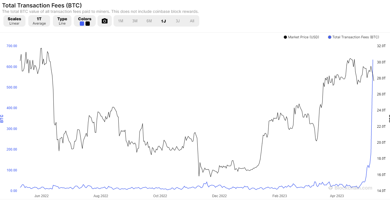Dadurch explodierten die Transaktionskosten, wie der unten abgebildete Graph verdeutlicht. Die gesamten Transaktionsgebühren im Bitcoin-Netzwerk zeigen den BTC-Gesamtwert aller an die Miner gezahlten Transaktionsgebühren – im Bild durch den blauen Graphen visualisiert.