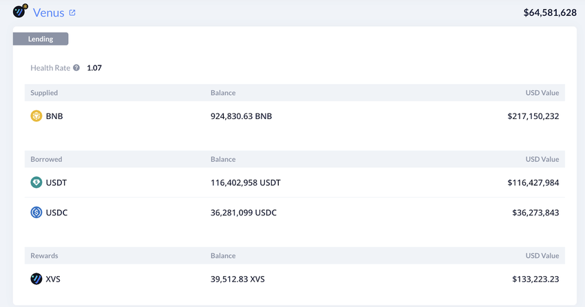 Ein User hält derzeit eine beliehene Position im Wert von 924.830 BNB auf der DeFi-Plattform Venus Protocol. Sollte der User den Kredit nicht zurückzahlen oder die Einlagen erhöhen, könnte seine Position zwangsgeschlossen werden und den Verkaufsdruck auf den Markt erhöhen.