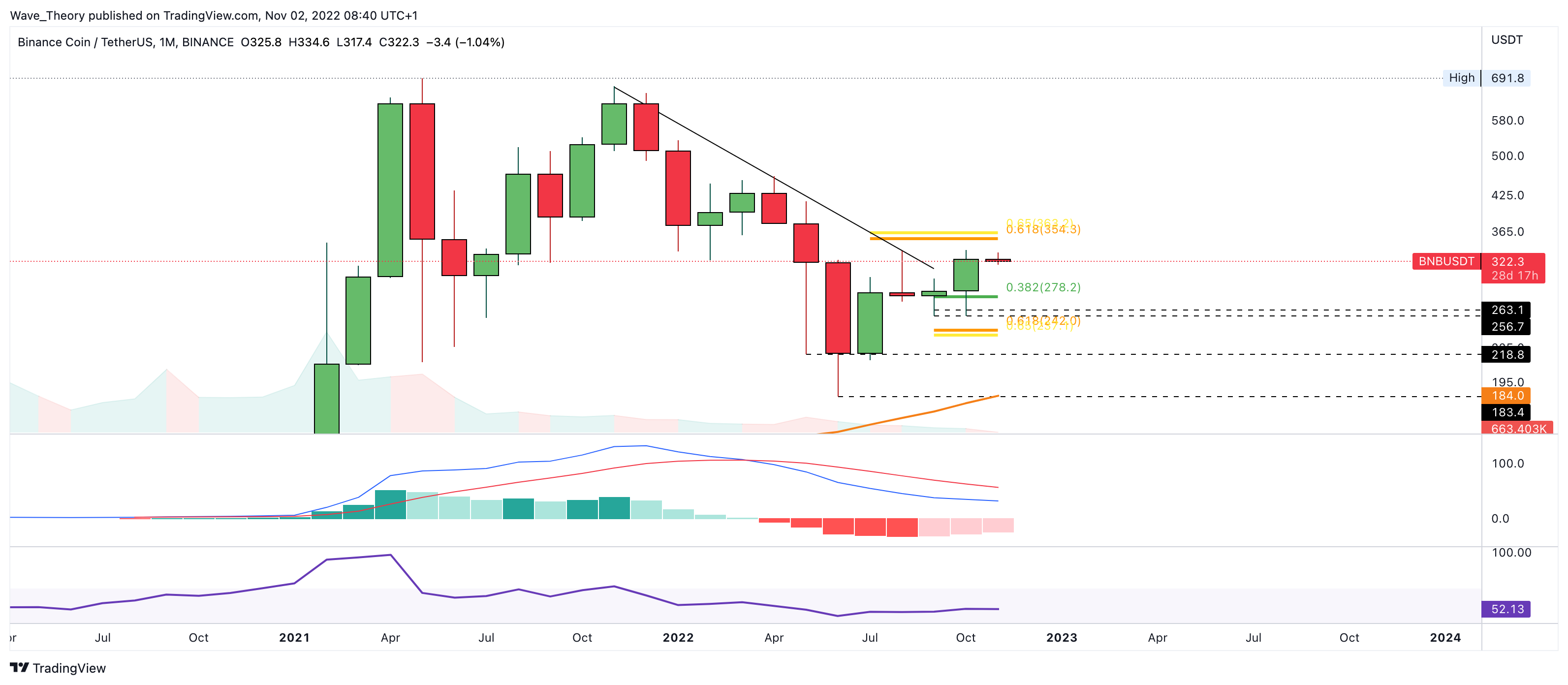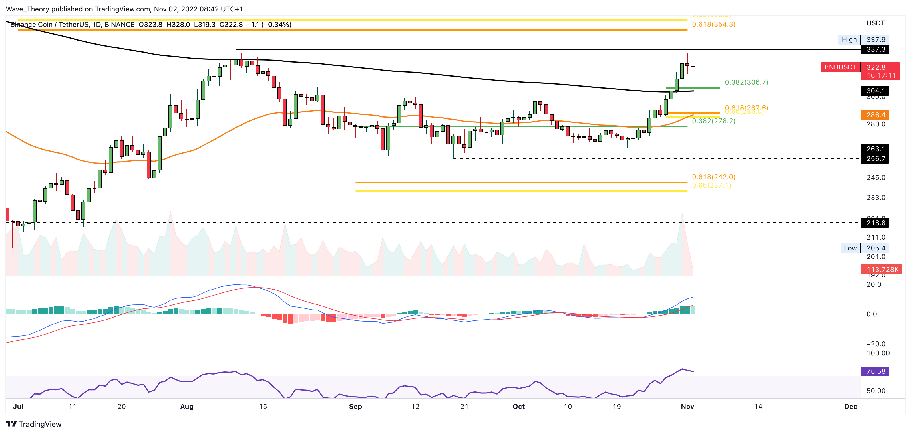 Der BNB Kurs erreichte nach unserer letzten Kurs Prognose die Unterstützung zwischen 256 USD und 263 USD und prallte daran erneut ab. Anschließend stieg der Binance Coin Kurs auf rund 338 USD, wo der Hochpunkt vom August liegt.