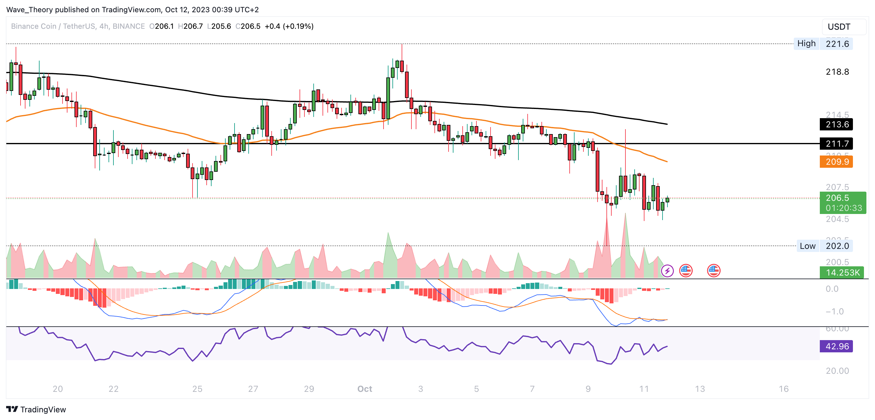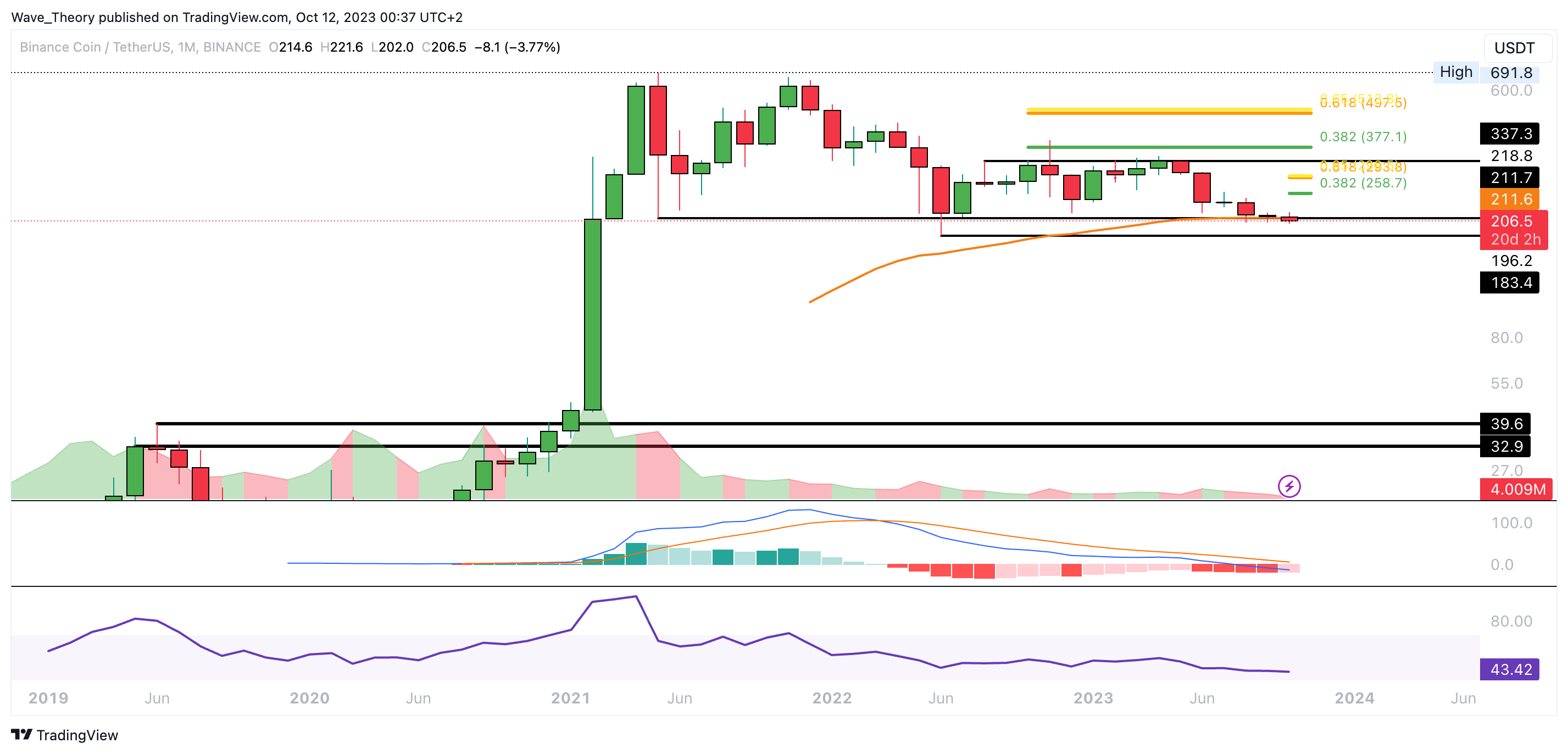 Der Binance Coin Kurs befindet sich immer noch an der 50-Monate-EMA Unterstützung bei rund 211,6 USD