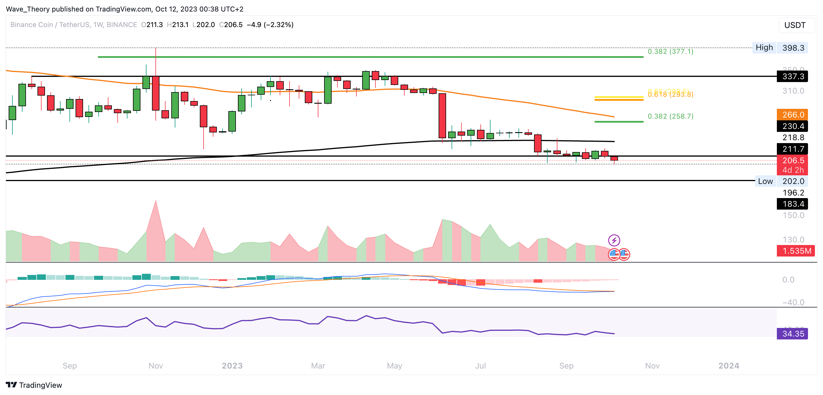 Der BNB Kurs befindet sich immer noch an der 50-Monate-EMA Unterstützung bei rund 211,6 USD. Seit drei Monaten hält sich der Kurs über diesem Preisniveau.