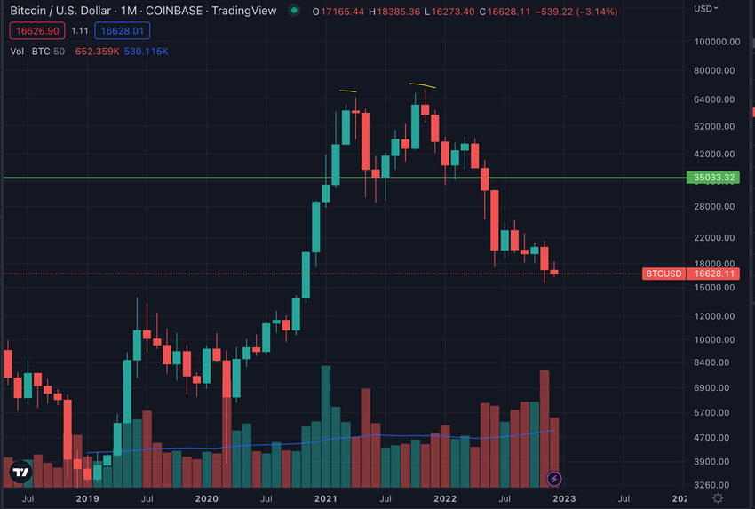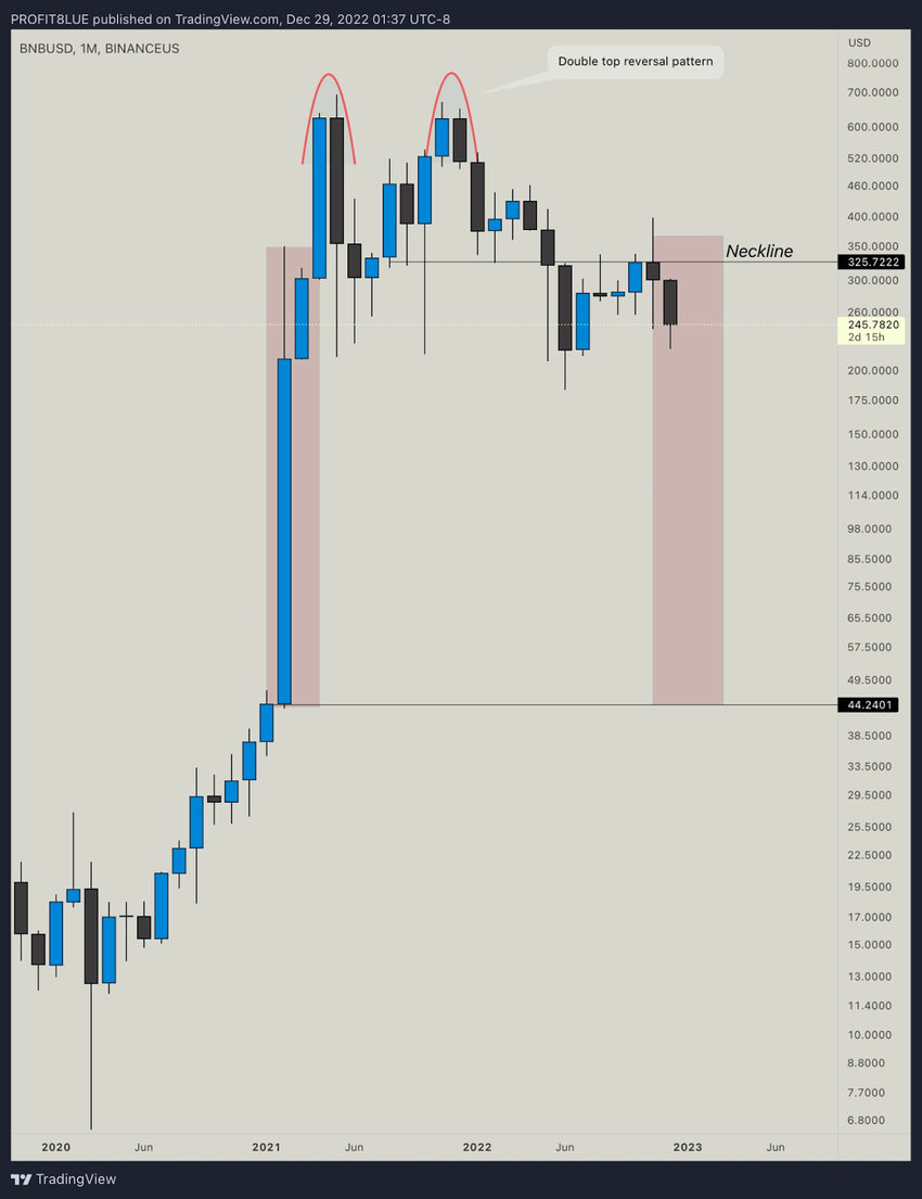 Profit BLUE behauptet weiter, der Binance Coin Kurs forme das gleiche Umkehrmuster wie Bitcoin, bei dem der Kurs von 69.000 auf 15.000 US-Dollar fiel. Der Bitcoin Kurs formte ebenfalls ein Double-Top-Muster auf dem Monatschart, wobei sich die Nackenlinie bei 35.000 US-Dollar befindet. Nachdem der BTC Kurs diese durchbrochen hatte, sank der Preis um mehr als 50 % (aktuell 16.600 US-Dollar).
