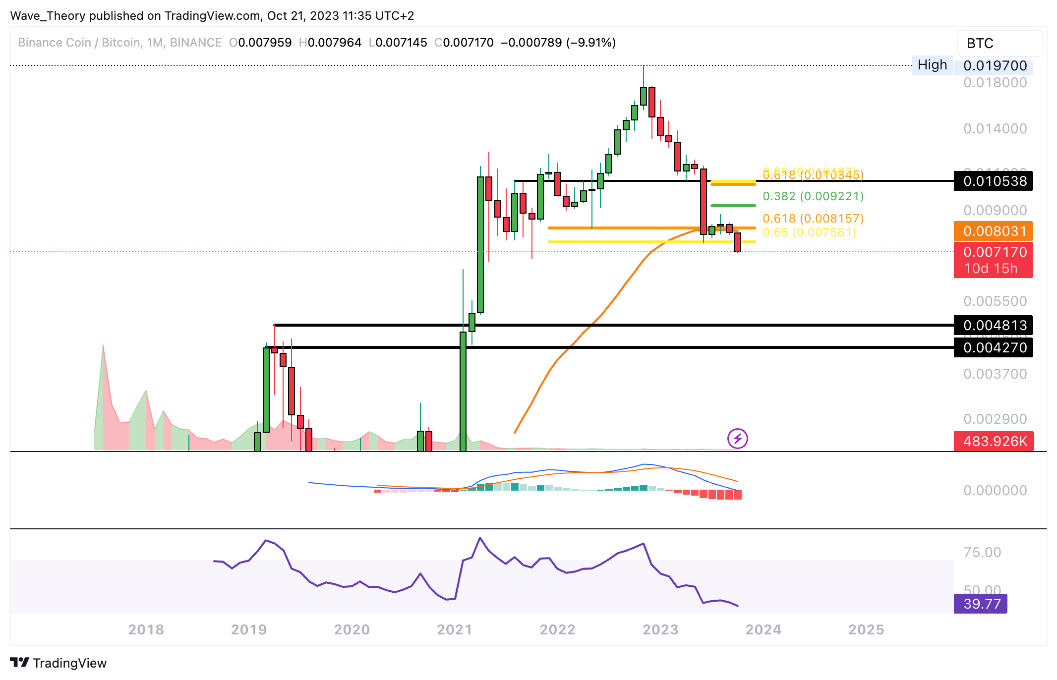 Gegen BTC scheint der BNB Kurs die 50-Monate-EMA Unterstützung bei rund 0,008 BTC bärisch zu brechen. Damit könnte der Kurs zur nächsten Unterstützung zwischen rund 0,00427 BTC und 0,0048 BTC korrigieren.