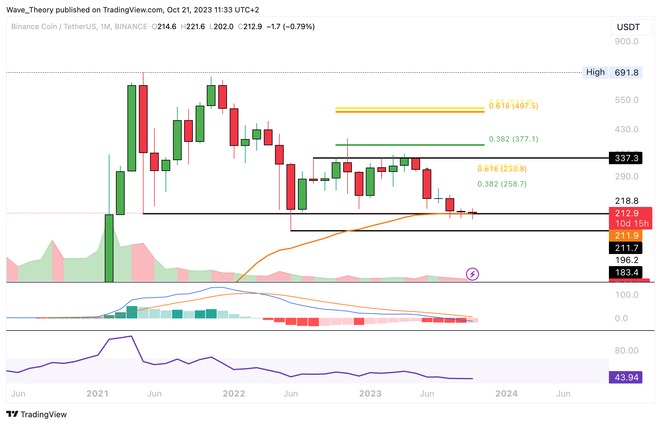 Sollte der BNB Kurs jetzt an der 50-Monate-EMA Unterstützung bei rund 212 USD bullisch abprallen können, warten bei rund 259 USD und 300 USD die nächsten signifikanten Fib Niveaus.