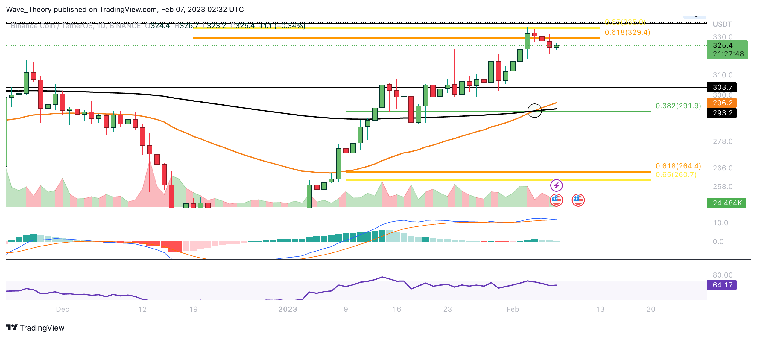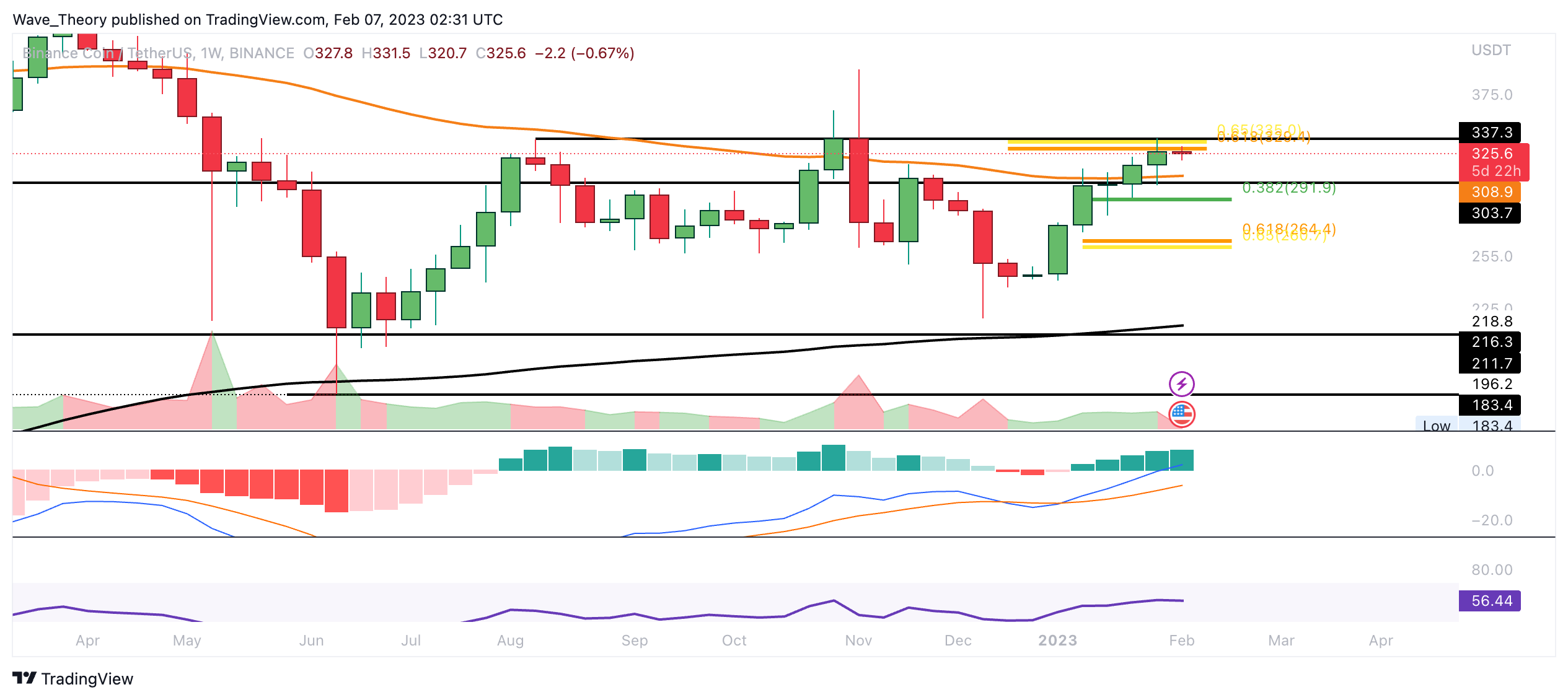 Aktuell stößt BNB auf signifikanten Fib Widerstand an der Golden Ratio bei rund 330 USD.