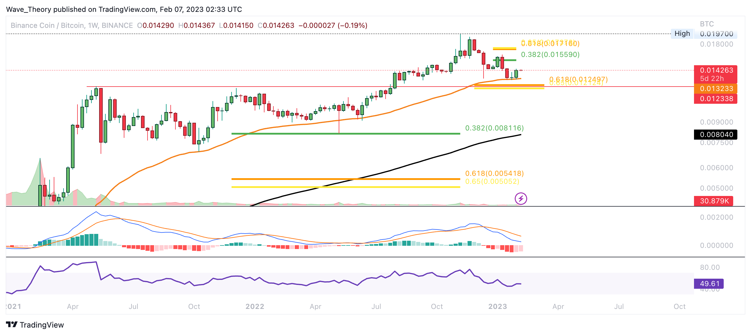 Gegen BTC prallte der BNB Kurs am 50-Wochen-EMA ab