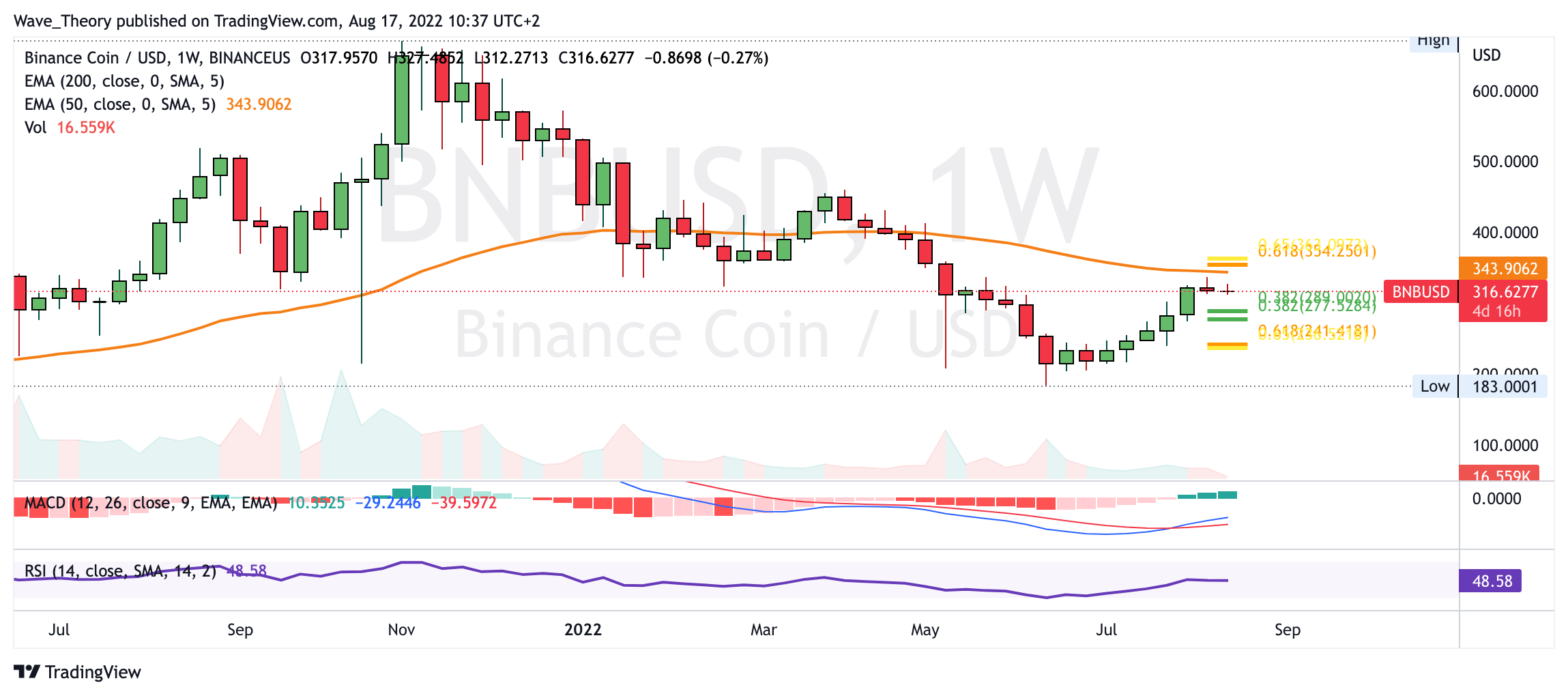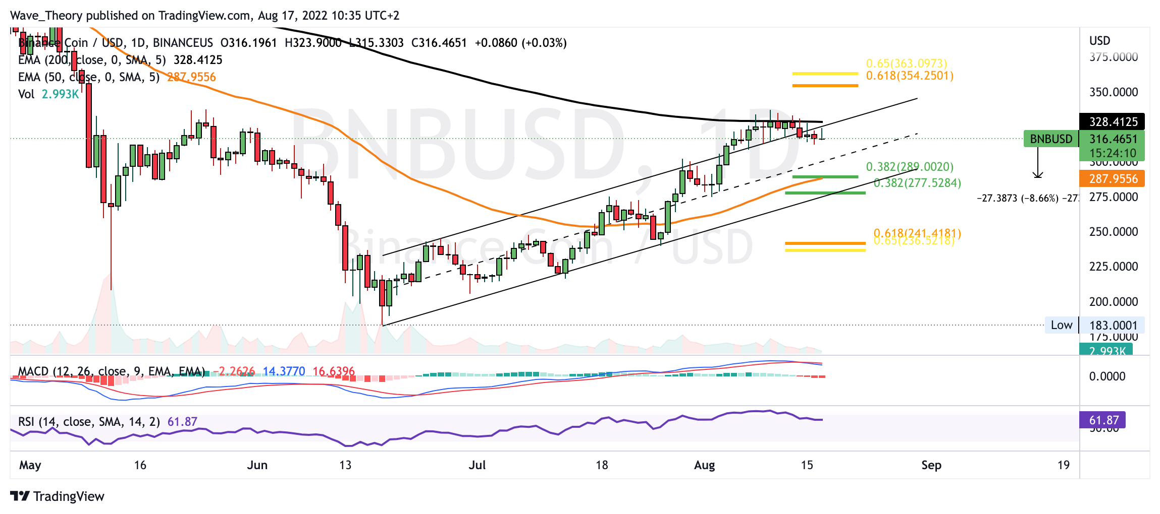 Der BNB Kurs wurde am 200-Tage-EMA Widerstand bei rund 330 USD bärisch abgewiesen. Fällt der BNB Kurs jetzt auf 289 USD?