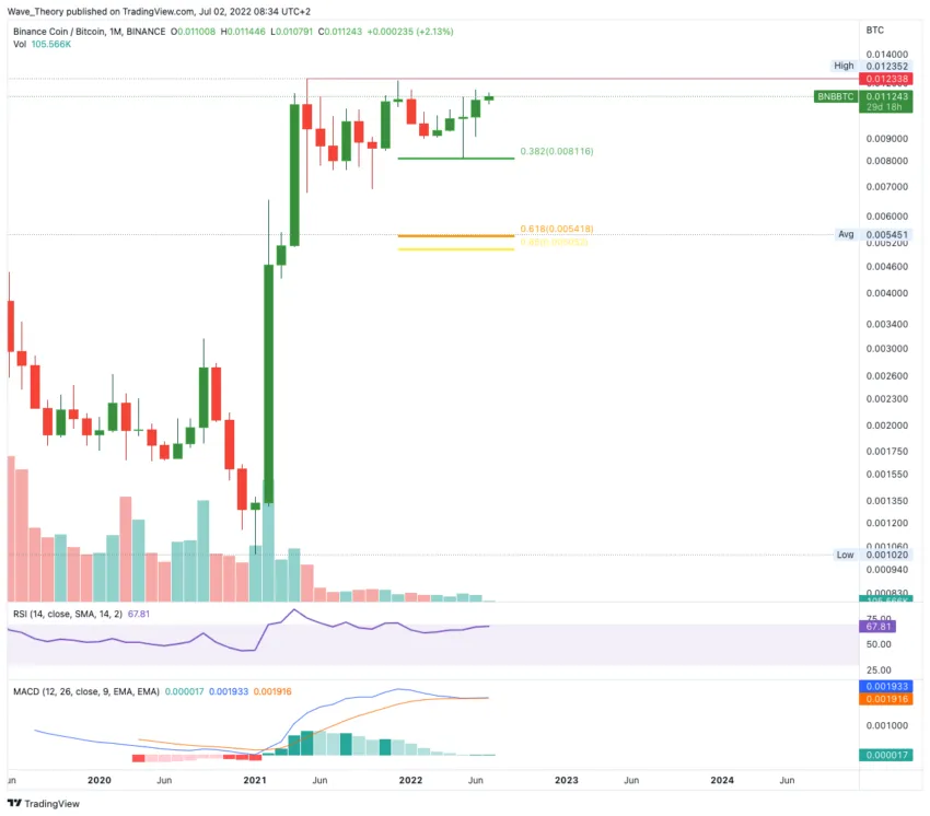 Auch gegen BTC prallte der BNB Kurs vor Kurzem sehr stark an einer Fibonacci Unterstützung ab. Seit BNB am 0,382 Fib Niveau bei rund 0,0081 BTC abprallte, bewegte sich BNB erneut in Richtung des ATHs bei rund 0,01234 BTC. Zuletzt konnte der BNB Kurs dieses Hindernis aber nicht überwinden und sollte BNB erneut daran scheitern, könnte der BNB Kurs zur Fibonacci Unterstützung bei rund 0,0081 BTC zurückkehren.