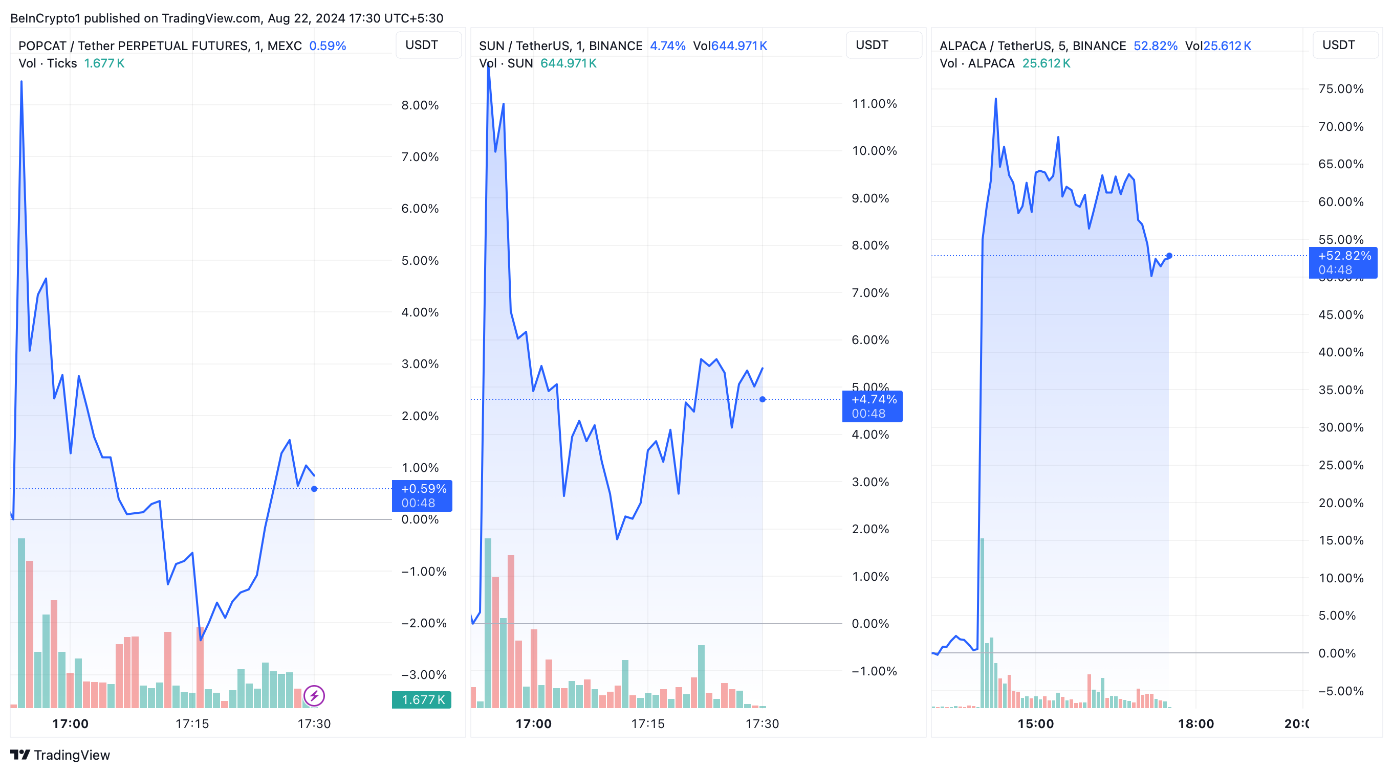 Der Beginn des Handels hatte sofortige Auswirkungen auf die Kryptowährungswerte. ALPACA erlebte einen erheblichen Anstieg, stieg zunächst um über 70 Prozent und liegt immer noch um 52 Prozent höher.