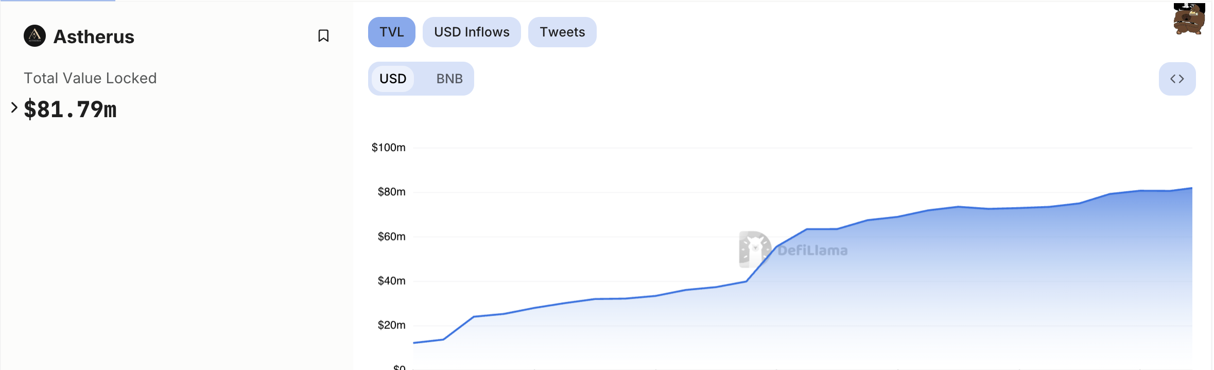 Unter den ausgewählten Projekten sticht Astherus hervor, ein Liquiditätshub für gestakte Vermögenswerte, trotz einer bescheidenen X-Präsenz von weniger als 6.000 Followern. Als das größte Derivateprojekt auf der BNB-Kette positioniert, verfügt Astherus über einen gesamten gesperrten Wert von 81,79 Millionen USD laut Daten von DeFiLlama.