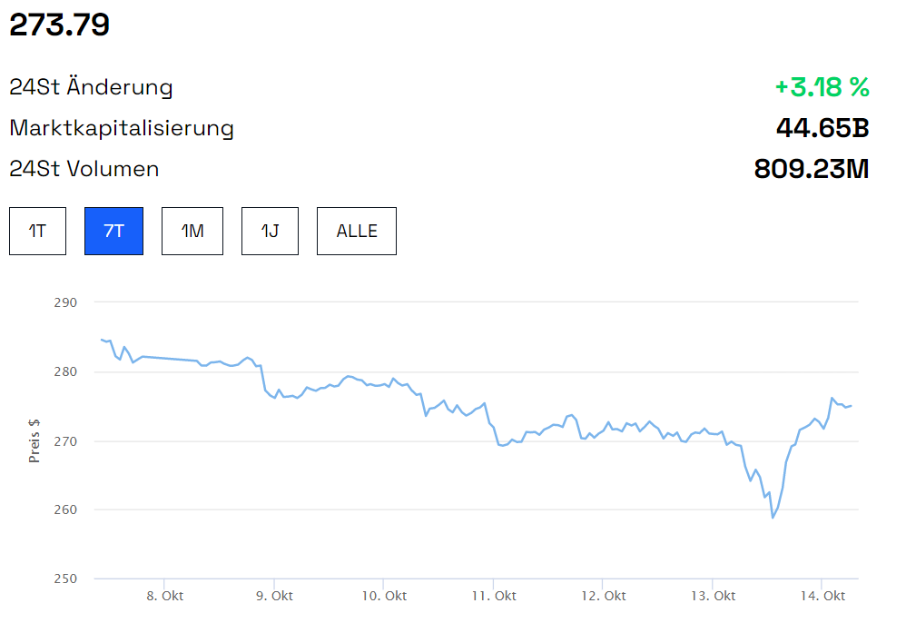 Der Binance Coin (BNB) Kurs notiert zurzeit bei 273,79 US-Dollar.