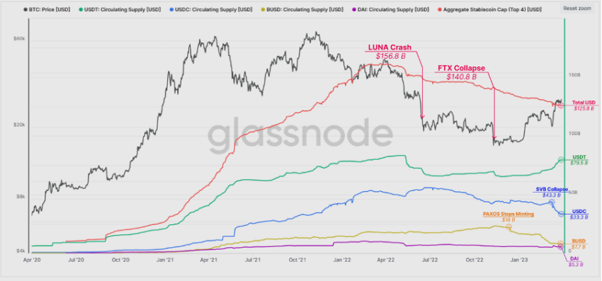 Ein Blick auf die untere Grafik verdeutlicht, wie stark der Marktanteil von BUSD im Vergleich zu anderen Stablecoins wie USDT oder USDC zurückging. Viele Investoren:innen wandelten ihre BUSD in andere Assets um, weshalb das verfügbare BUSD Angebot um 52 % bzw. auf 7,7 Milliarden US-Dollar fiel, so Glassnode-Daten.