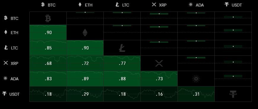 Sponsored SponsoredInteressanterweise steigt die Korrelation erst im April 2020 dauernd an. Genau zum Beginn der Pandemie! Teilweise war diese sogar bei 0,6. Weil sich durch die COVID-Krise günstige Marktkonditionen entwickelten, stieg sie zwischen BTC und Aktien an. Wenn du nun glaubst: “Halt! Da steht doch nur Bitcoin – das bezieht sich nicht auf alle Kryptos”, dann liegst du nur teilweise richtig. Statisch ist auch bewiesen, dass die Korrelation von Bitcoin zu anderen Kryptos sehr hoch ist: