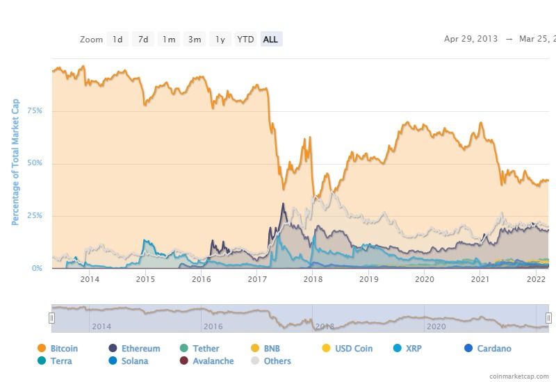 Jahrelang war es wirklich so, dass Bitcoin fast den gesamten Marktanteil im Kryptomarkt innehatte. Erst Ende 2017 als Ethereum populärer wurde, sank der Marktanteil zum ersten Mal unter 75 Prozent.