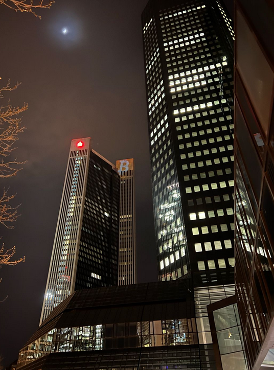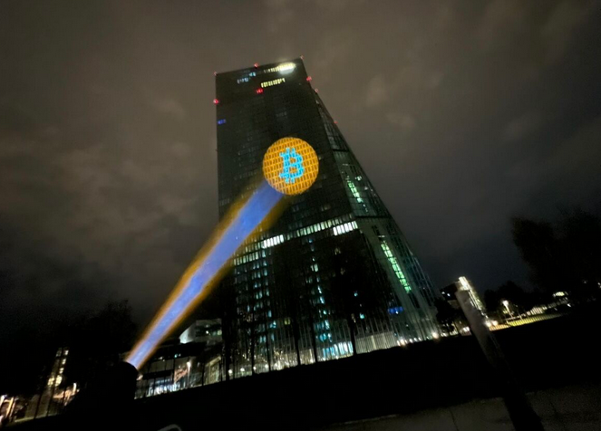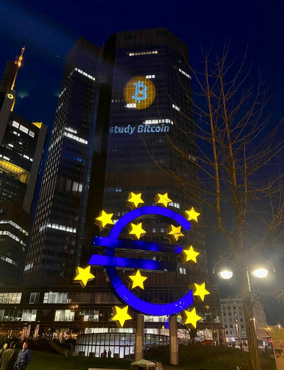 Am Abend des 29. März erstrahlten sowohl der Eurotower als auch das Gebäude der Europäischen Zentralbank (EZB) in Bitcoin-Orange.