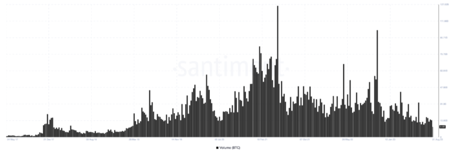 Eine der ersten alarmierenden Kennzahlen, die auf ein sinkendes Interesse an BTC schließen lassen, ist das Handelsvolumen.