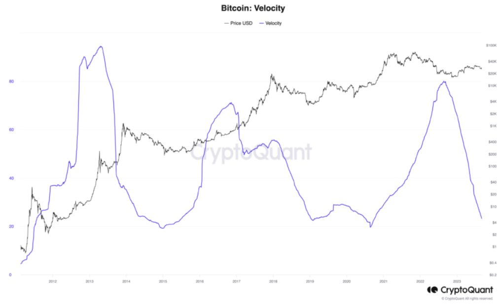 * Die Bitcoin Velocity ist eine Kennzahl, die die Geschwindigkeit misst, mit der BTC im Umlauf gehandelt wird. Ein Rückgang dieser Geschwindigkeit deutet auf eine verminderte Marktaktivität hin und kann auf eine Phase der Zurückhaltung oder Konsolidierung in der Kryptoindustrie hinweisen.