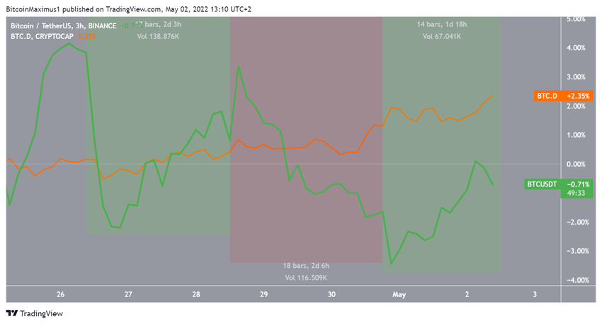 Sollte der Ausbruchsversuch erfolgreich sein, dann könnte tatsächlich ein Anstieg folgen. Die BTCD könnte dabei sogar auf 48 % ansteigen. Lass uns nun einen Blick auf die Korrelation zwischen der BTCD und dem Bitcoin Kurs werfen.