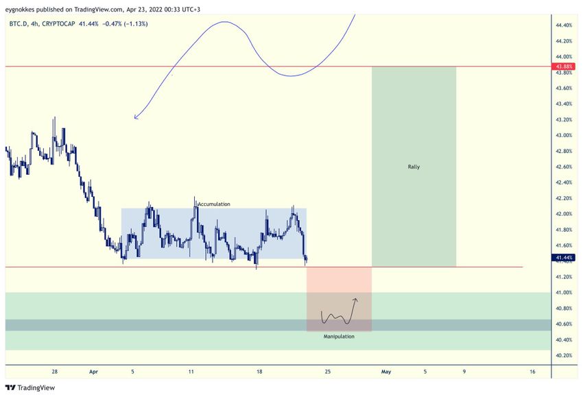 Der Krypto-Trader @eygnthebender veröffentlichte einen BTCD-Chart auf Twitter. Er ist der Meinung, dass wir mit einer Rallye auf 44 % rechnen können.