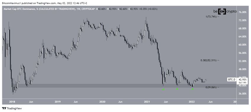 Auf dem Wochenchart kannst du sehen, dass die Bitcoin Dominanz dreimal von dem Support-Bereich bei 40 % abgeprallt ist und sich ein Triple-Bottom-Pattern entwickelte. Die Wochenkerze hat seit Januar 2018 nicht mehr unter diesem Level geschlossen.