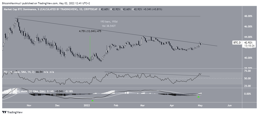 Auf dem Tageschart kannst du sehen, dass die Bitcoin Dominance Rate seit dem 21. Oktober 2021 (193 Tage) einer absteigenden Widerstandslinie folgte. Die BTCD ist gerade dabei, über diese Trendlinie auszubrechen.