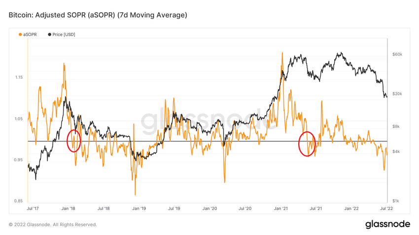 Das SOPR brach beispielsweise am 20. Januar 2018 unter die Linie (roter Kreis). Dies war ein Hinweis drauf, dass der bullische Trend vorbei ist. Am 11. Dezember 2018 (rund 11 Monate später) erreichte der Bitcoin Kurs dann den Boden, als der Indikator bei 0.86 stand.