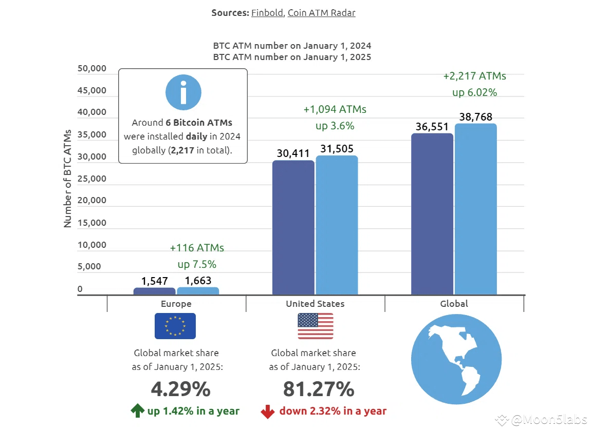 Spanien ist hierbei der größte Markt, mit 299 aktiven BTC-ATMs, gefolgt von Deutschland mit 108 und Polen mit 108 Geräten. Allein 2024 wurden in Europa 116 neue Maschinen installiert, was einem Wachstum von 7,5 Prozent entspricht.