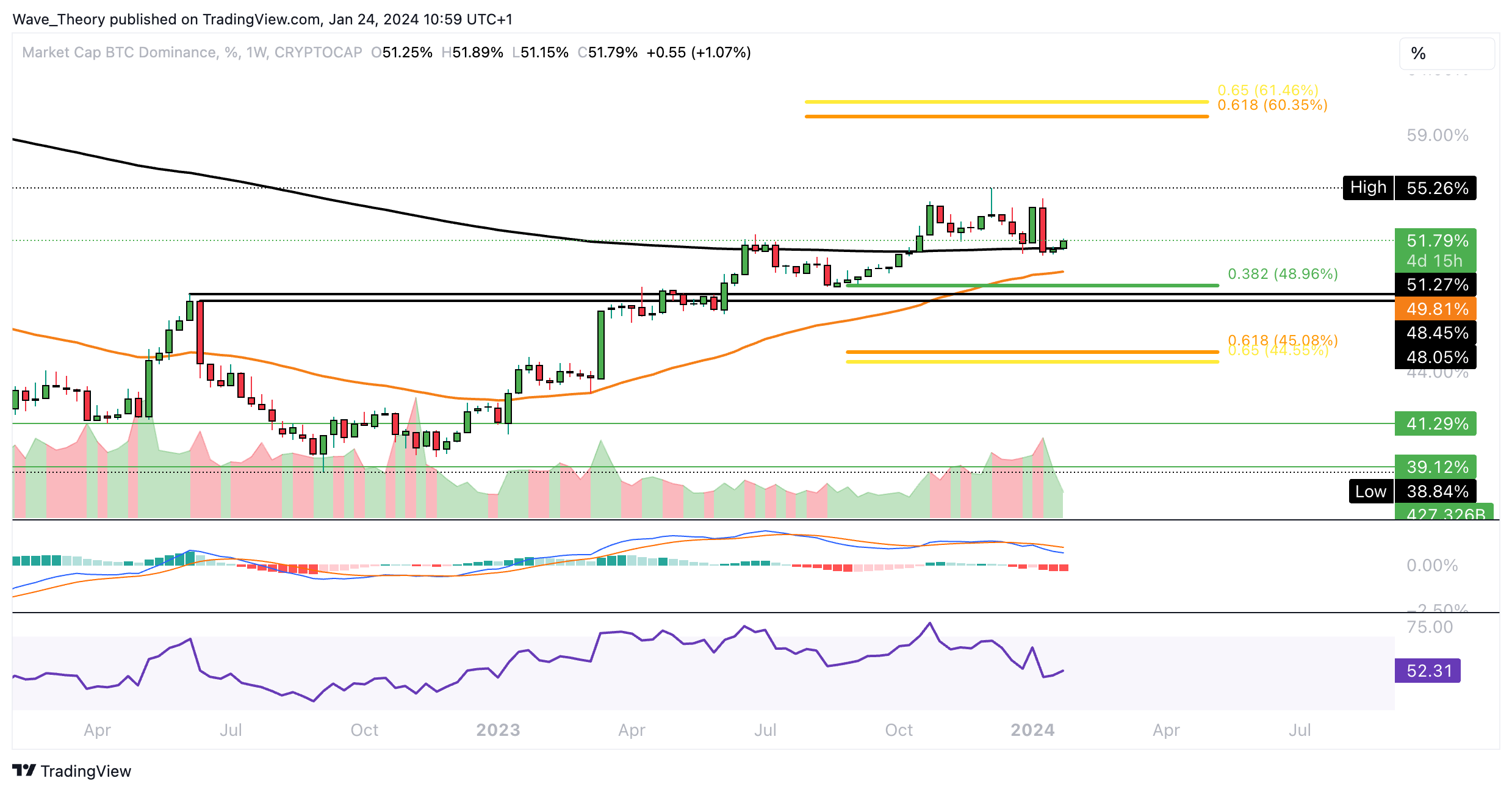 So befindet sich die Bitcoin Dominanz aber weiterhin unter dem 50-Monate-EMA bei rund 52,2 %. Die nächsten signifikanten Fib Unterstützungen warten damit bei rund 49 % und 45 %.