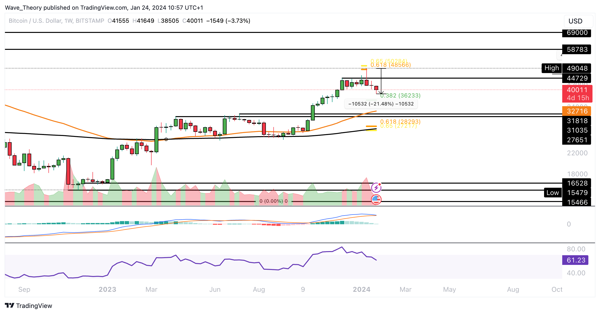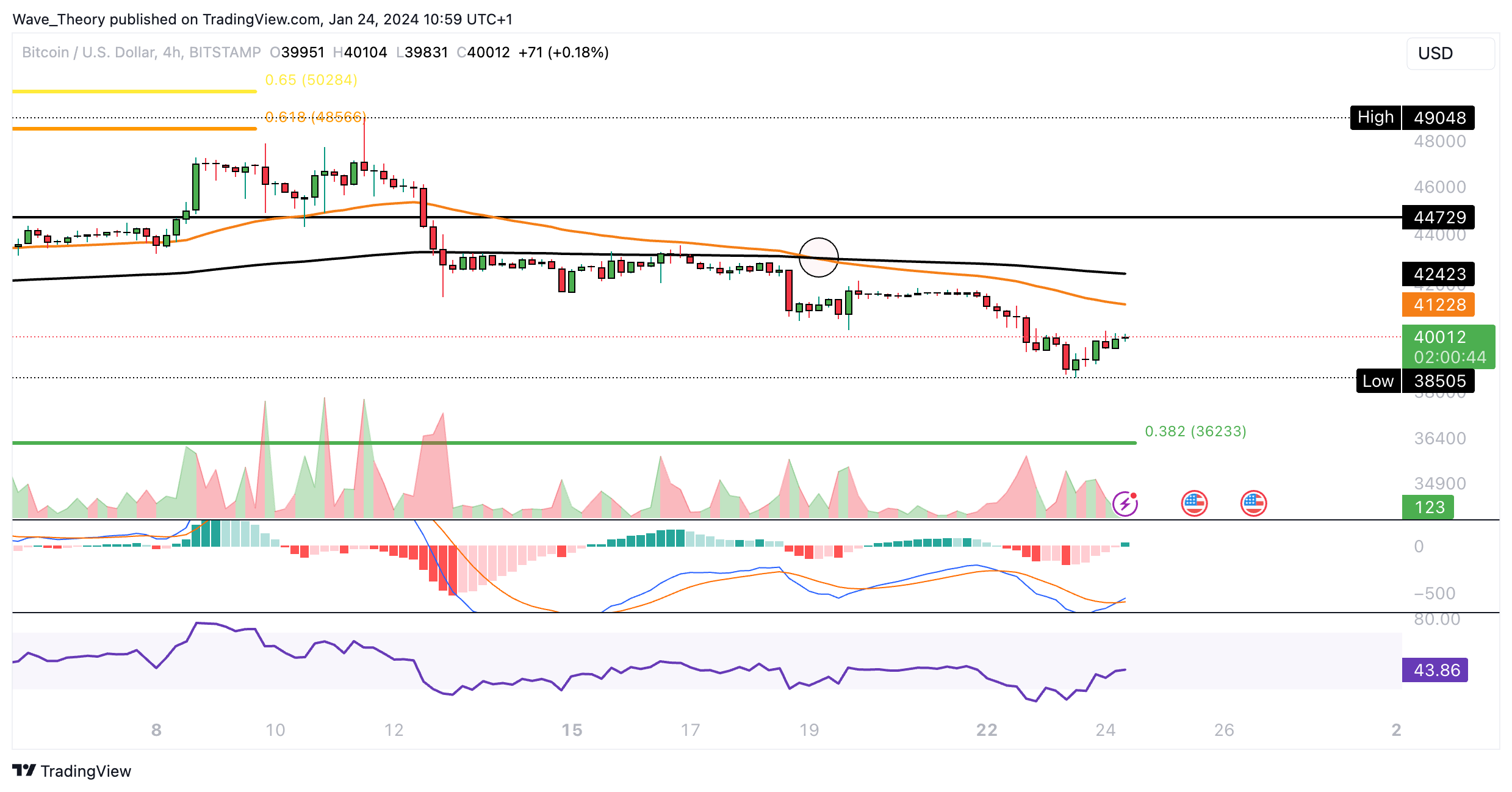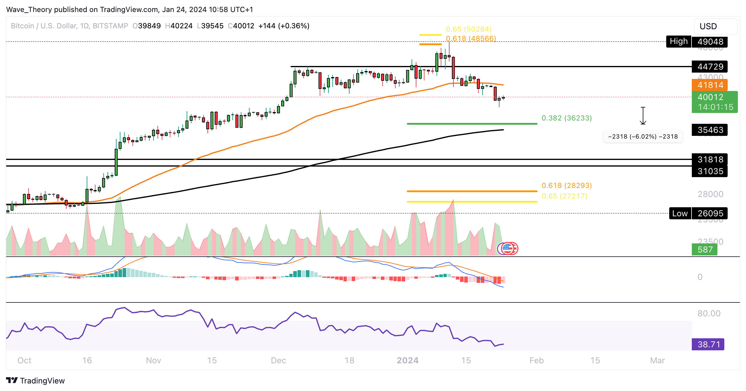 Die nächste signifikante Fibonacci Unterstützung wartet damit bei rund 36.233 USD.