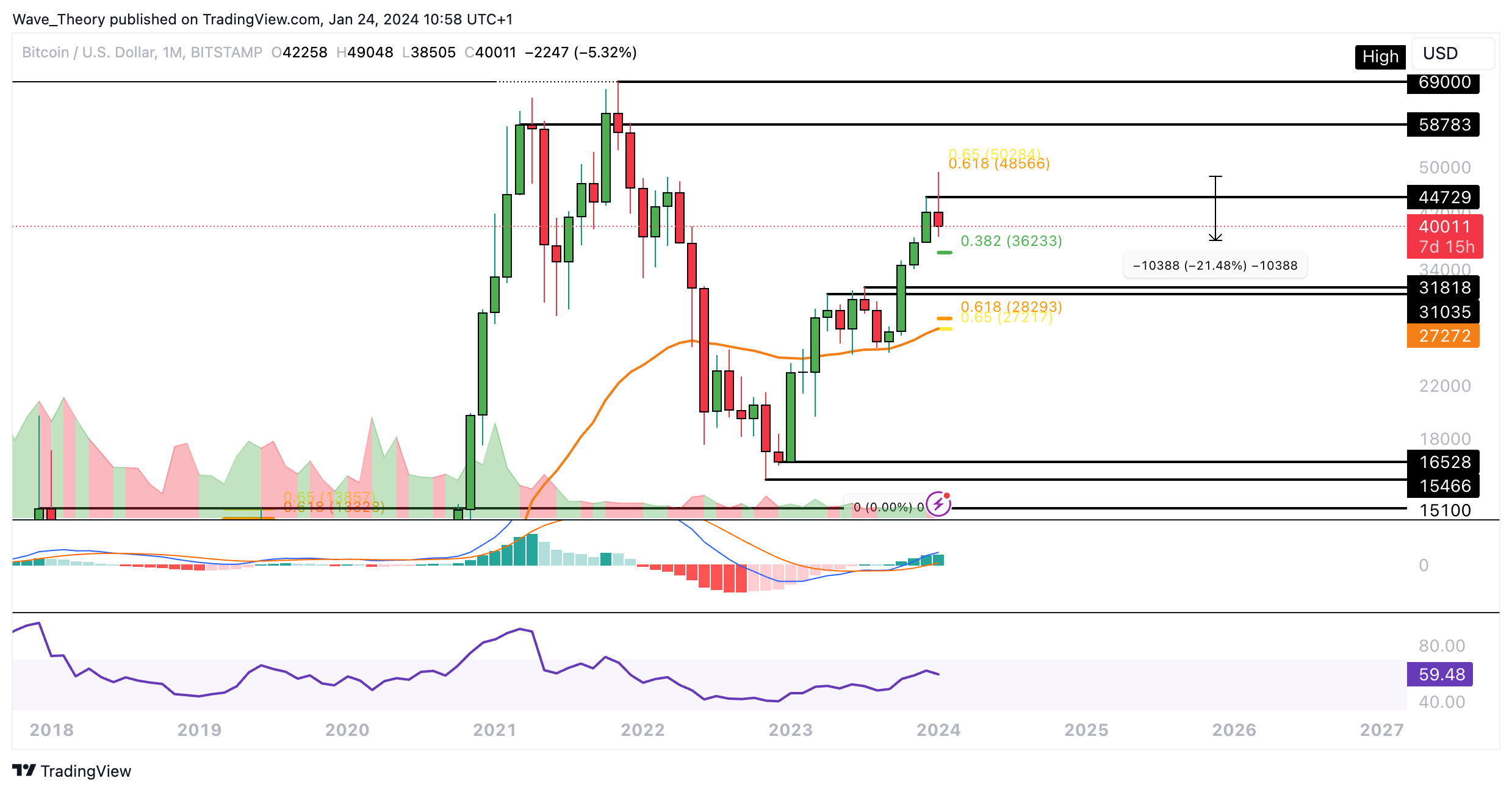 Dort fungiert der 50-Monate-EMA (bei rund 27.270 USD) als zusätzliche Unterstützung. Zunächst einmal wartet aber erst mal bei rund 36.233 USD signifikante Unterstützung auf den BTC Kurs.