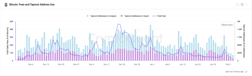 Zudem erlebte das Netzwerk einen Rückgang der Transaktionen: Von einem täglichen Höchststand bei 731.000 Ende Dezember 2023 auf ein Dreimonatstief von 278.000. Dieser Rückgang ist hauptsächlich auf die geringere Aktivität bei Inskriptionen und BRC-20-Token-Transaktionen zurückzuführen, vornehmlich bei solchen, die Taproot-Adressen nutzen. Diese sind sogar um 76 Prozent gefallen. Infolgedessen sanken die Bitcoin-Transaktionsgebühren von Mitte Dezember bis Anfang Februar um fast 90 Prozent.