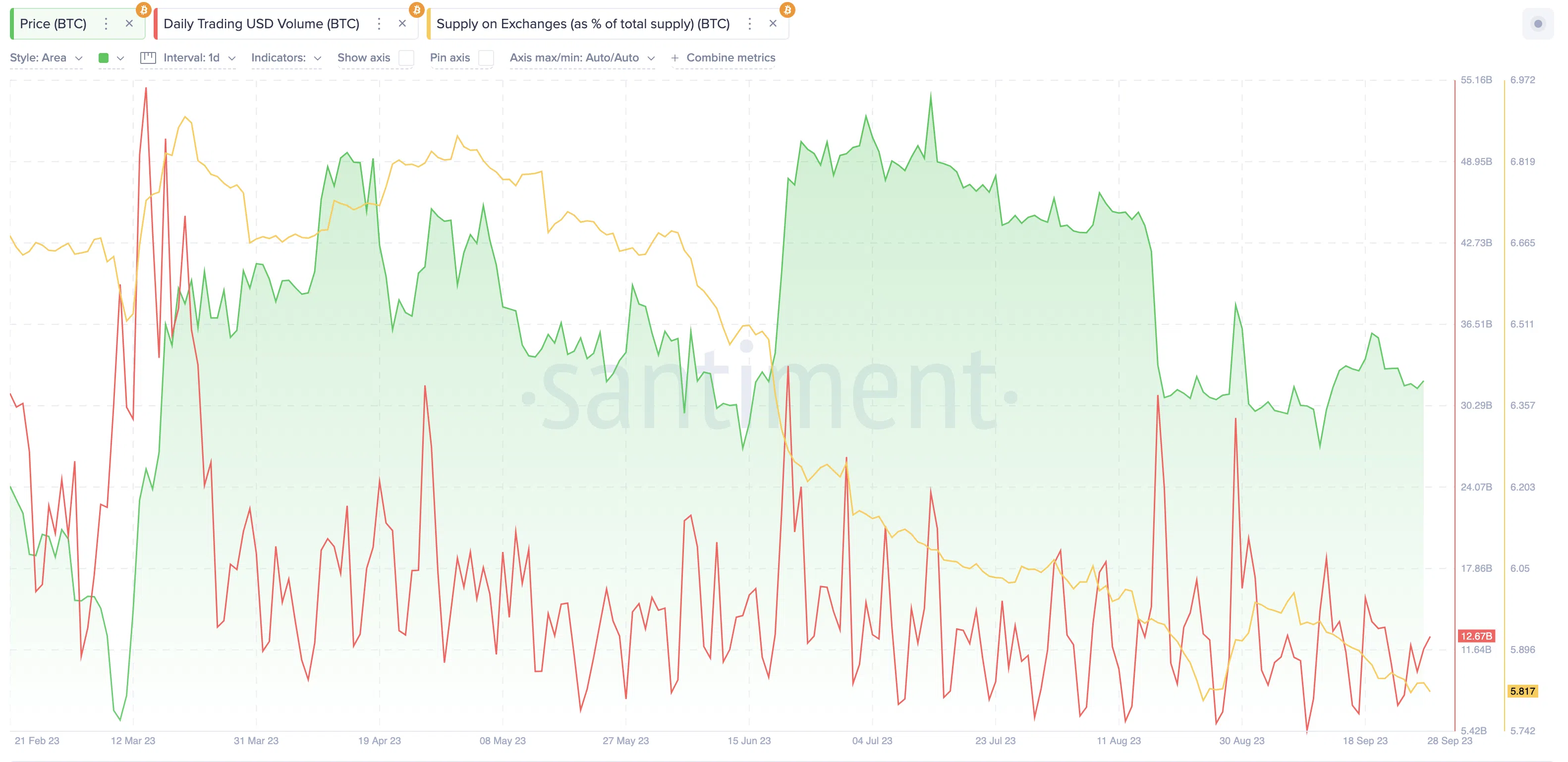 Dies wiederum führte zu einem erheblichen Rückgang des Börsenangebots. Wie unten dargestellt, befinden sich derzeit nur 5,83 % des zirkulierenden Angebots in den Wallets von Krypto Börsen – ein neues Tief seit dem 24. August.