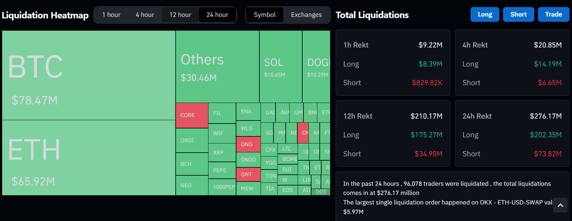 Dieser Gesamtbetrag umfasst 202,35 Millionen USD aus Long-Positionen und 73,82 Millionen USD aus Short-Positionen, laut Daten von CoinGlass.